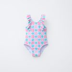 مایوی بدون آستین با یقه بیسیکلت و تزئینات فرفری. طرح گلدار.