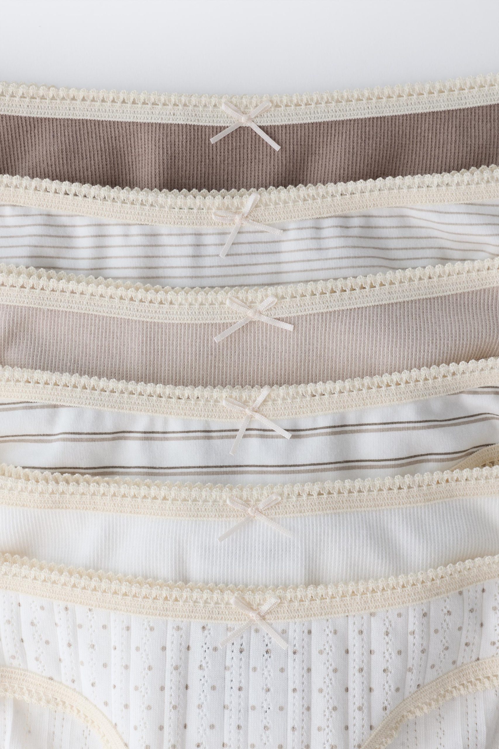 - Elastik belli ve ön kısmında kurdele detayı bulunan altılı külot paketi. Farklı baskılar.