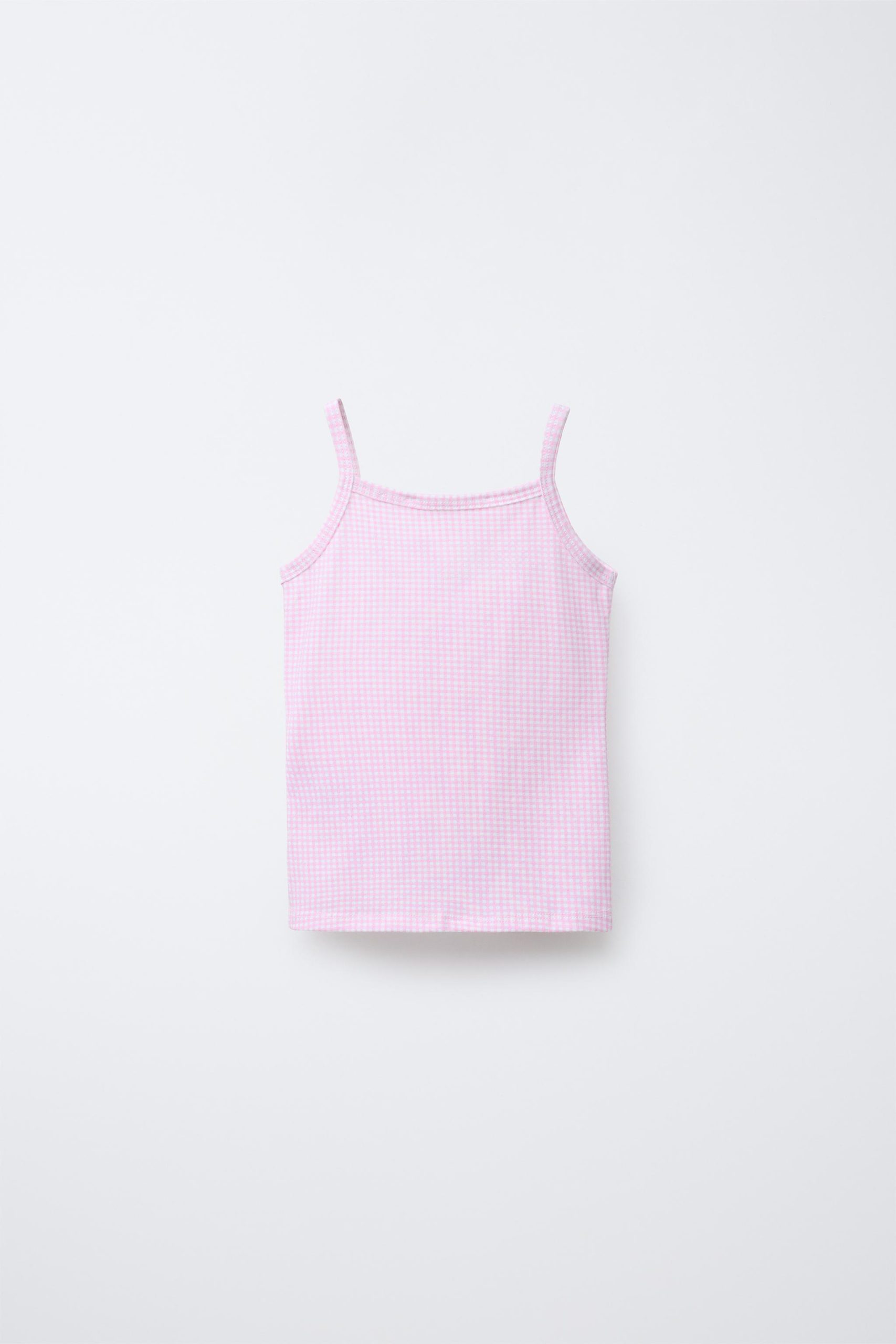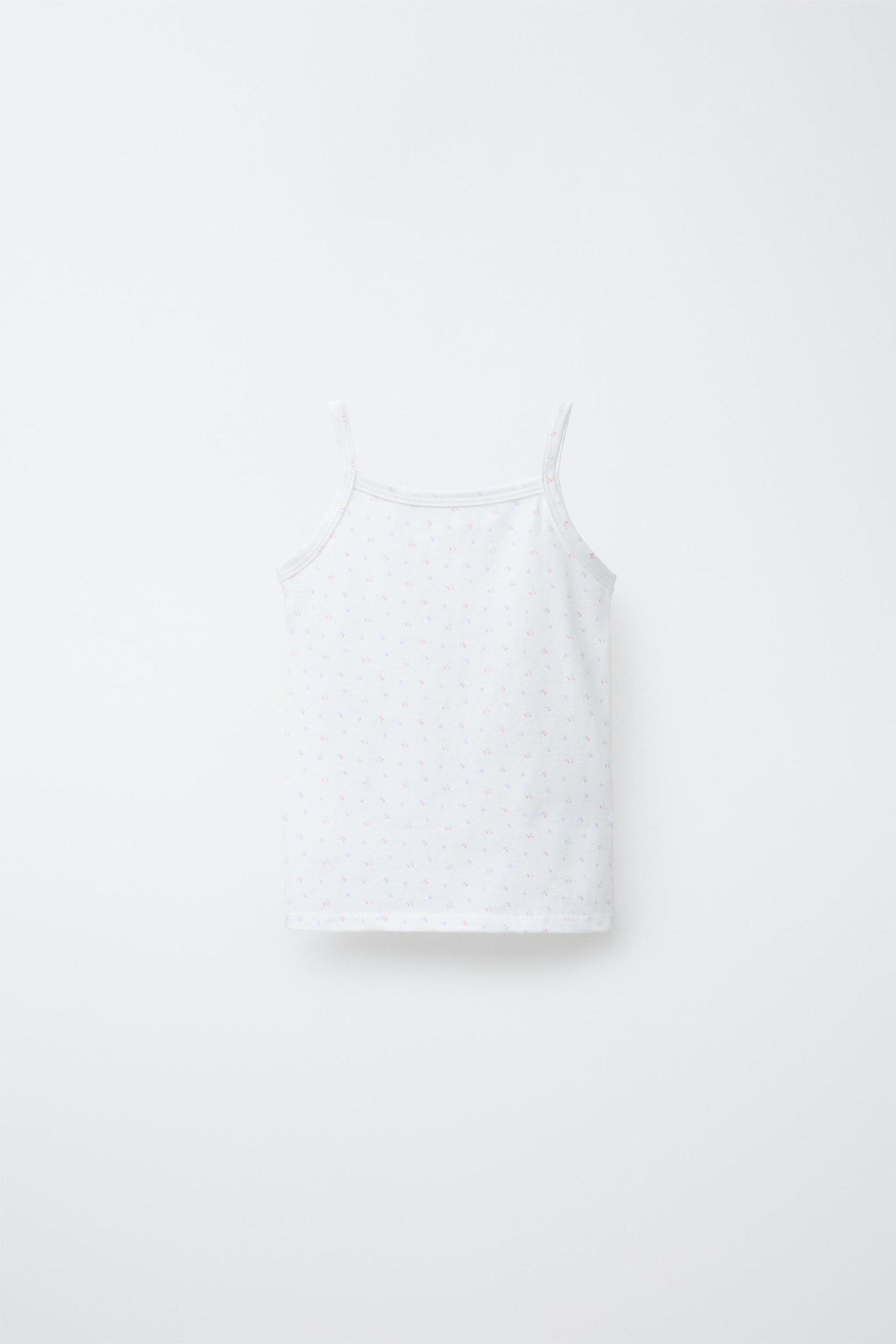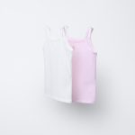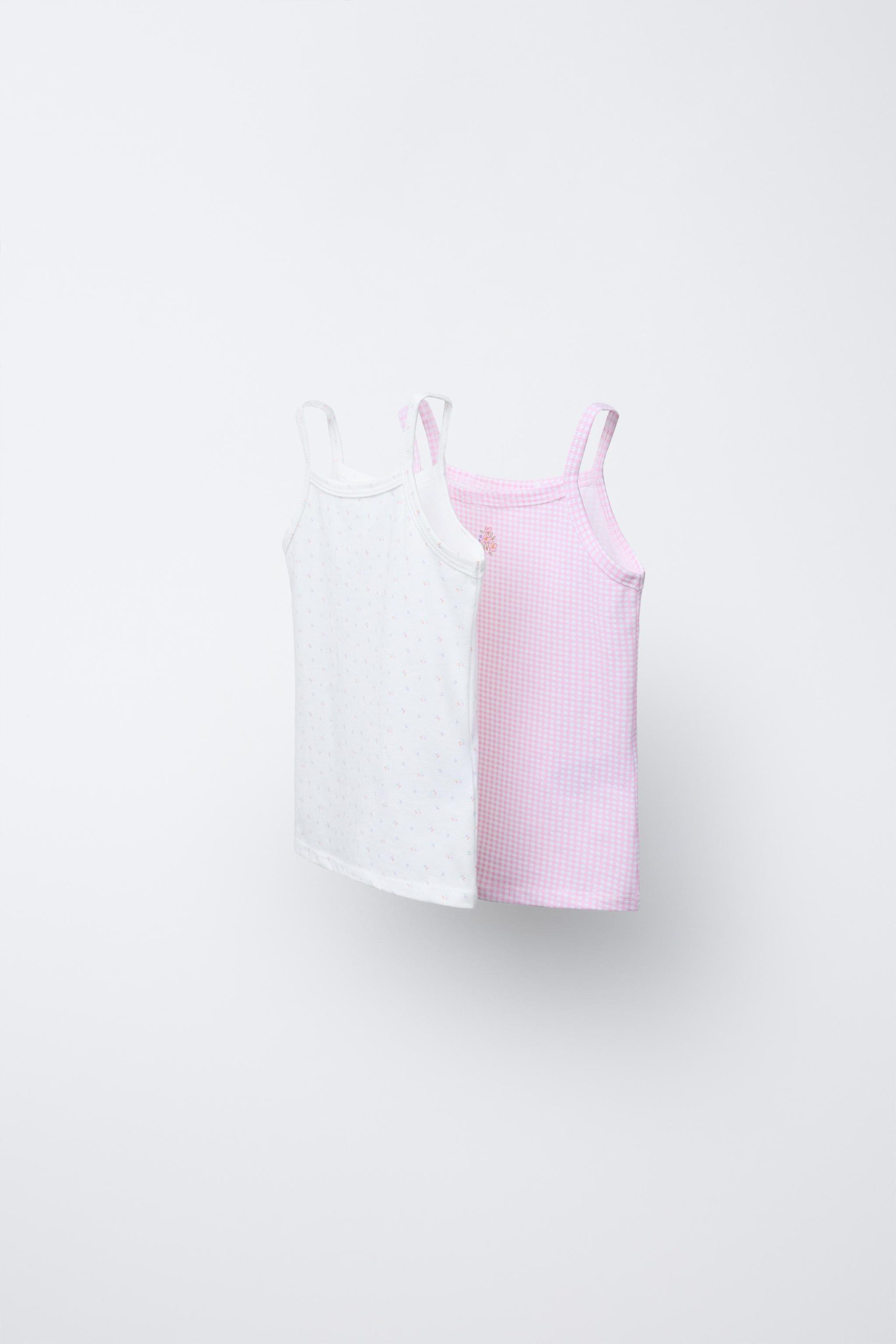 Düz yakalı ve askılı iki adet tişört içeren paket. Pötikareli ve çiçekli baskılı. %95 pamuklu kumaş.