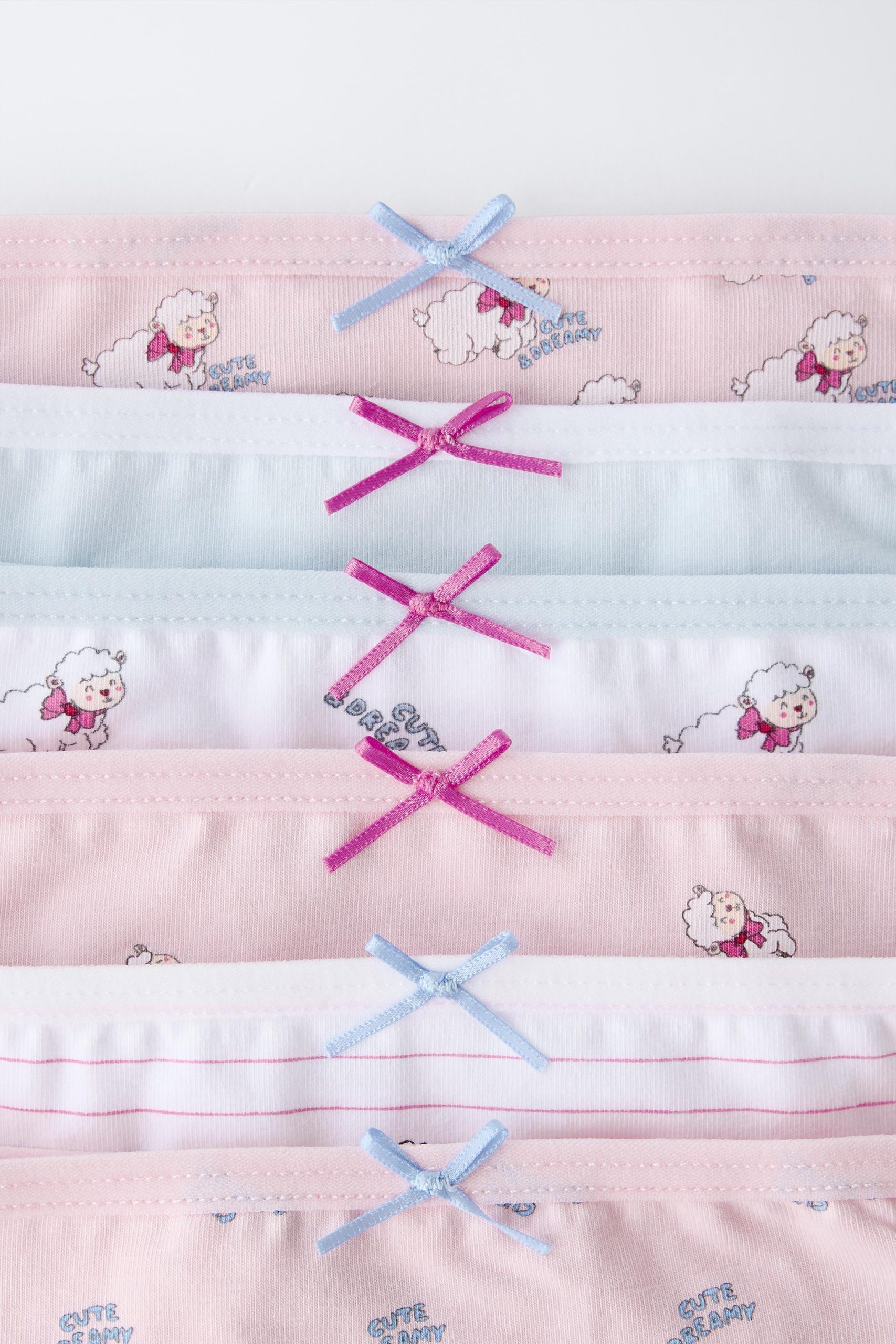 Altılı paket, elastik belli külot. Ön tarafında kurdele aplikeli. Koyun baskılı.
