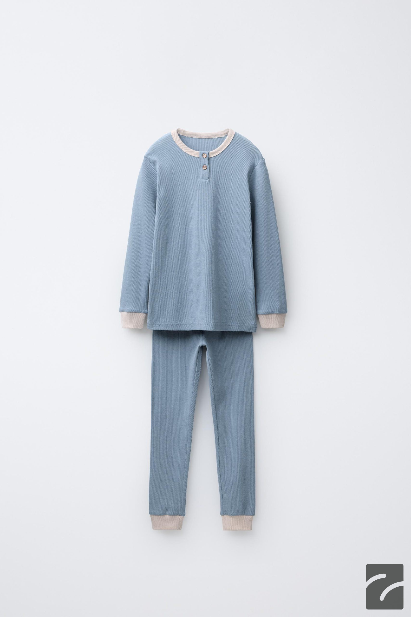 - İki parçalı pijama takımı. Bisiklet yakalı ve manşetli uzun kollu tişört. Robadan düğmeli. Lastikli belli ve manşetli paçalı pantolon.
