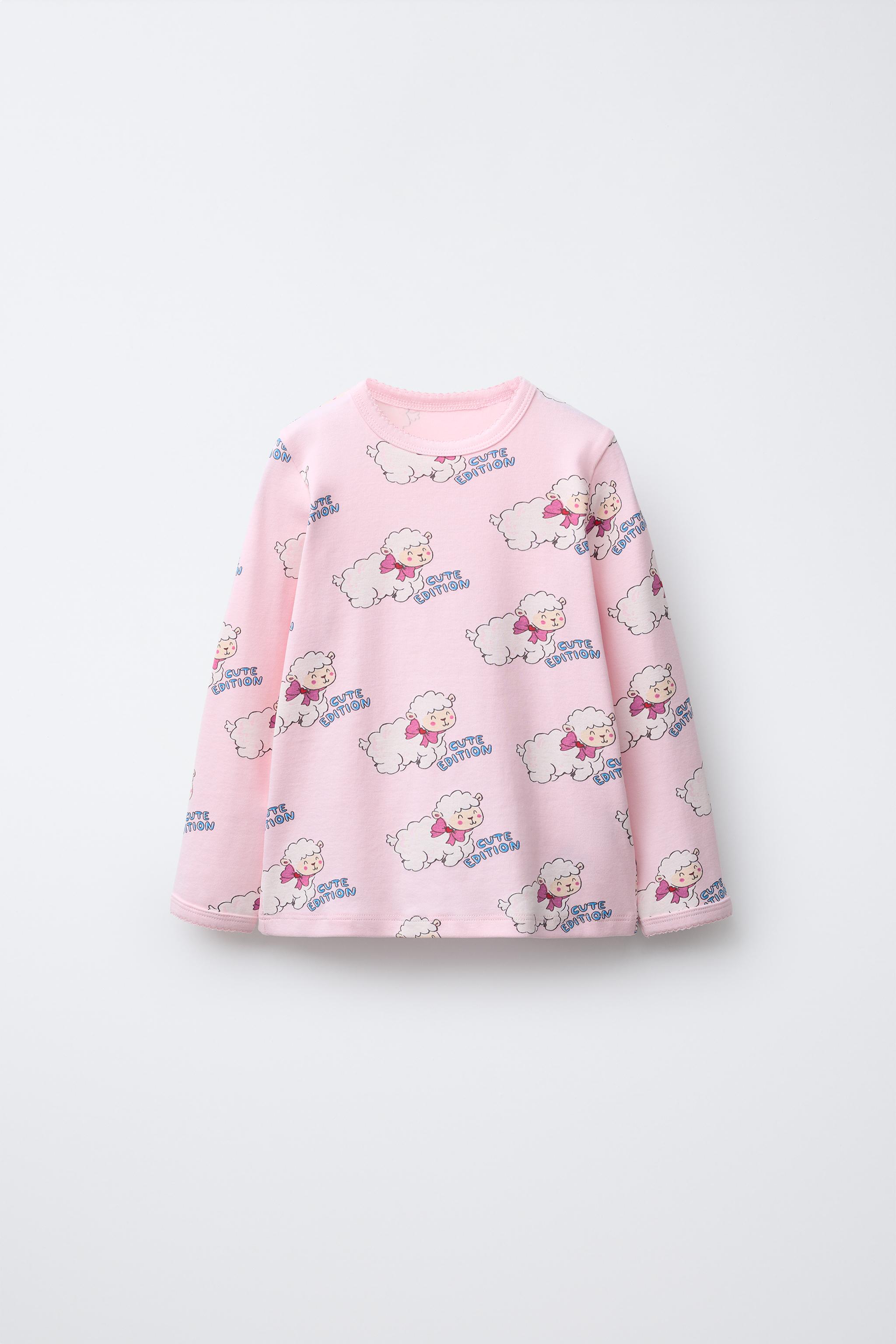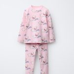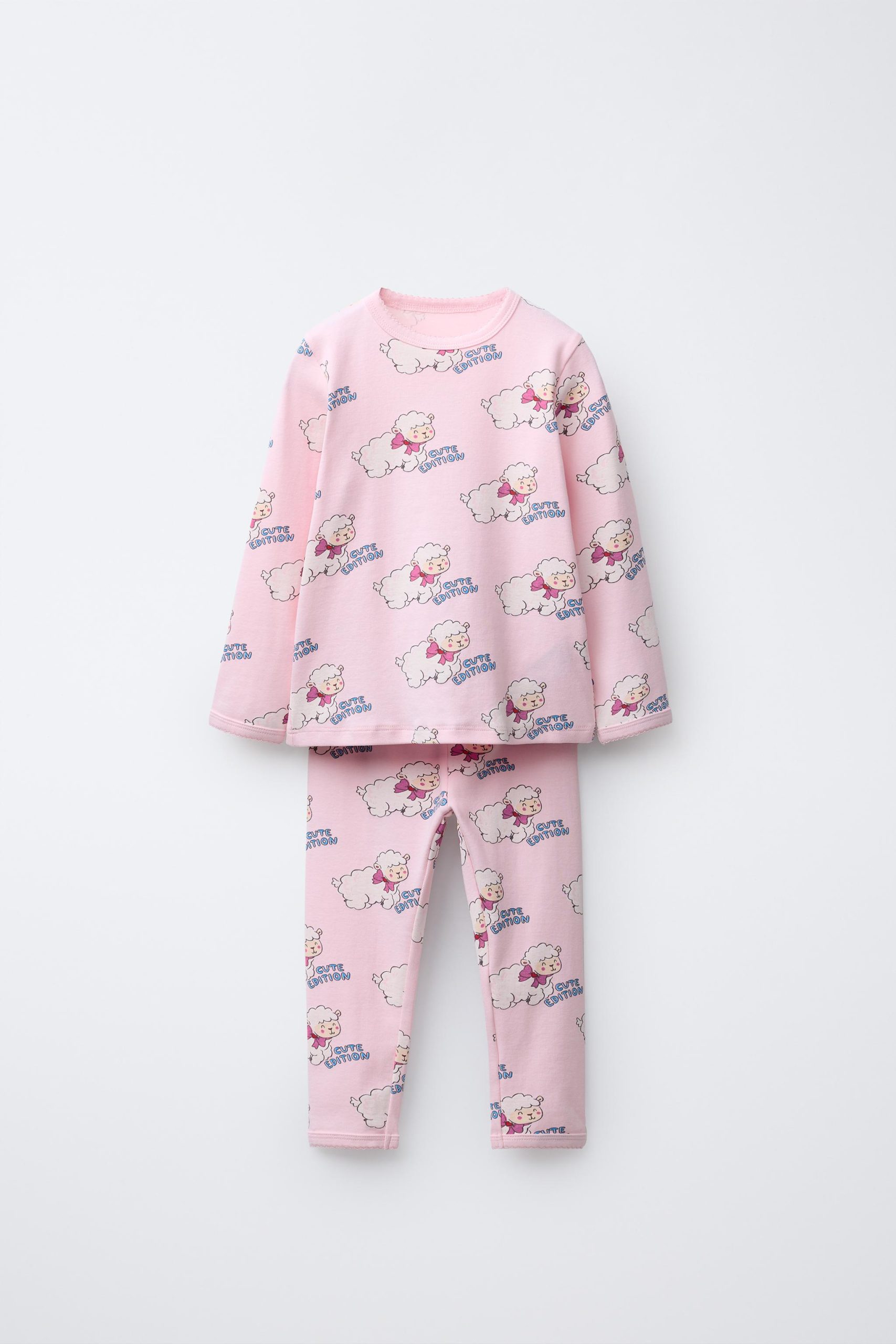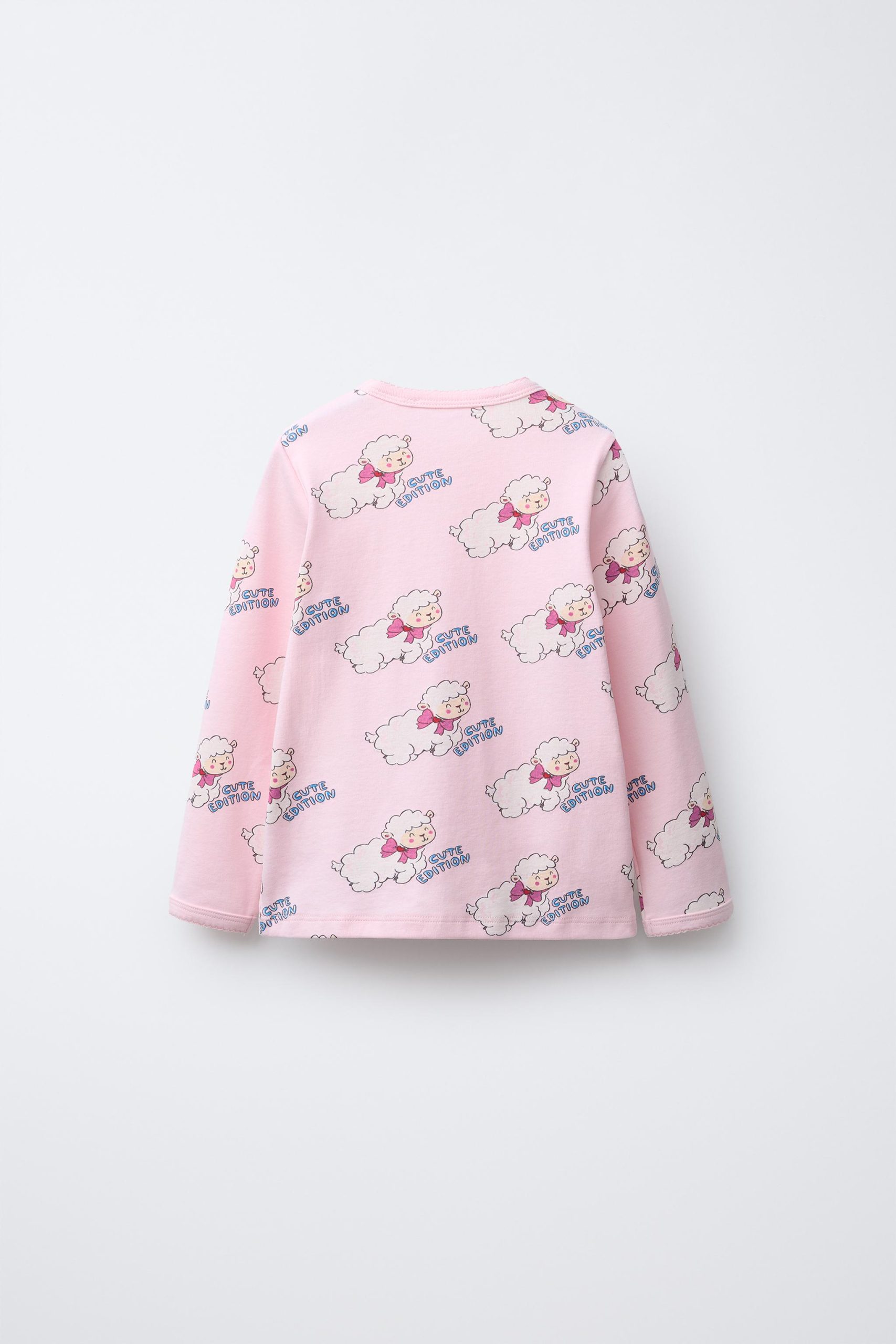 - İki parçalı pijama takımı. Bisiklet yaka ve uzun kollu tişört. Elastik belli pantolon. Dalgalı bitişler. Kuzu desenli.