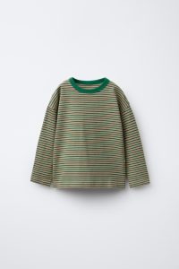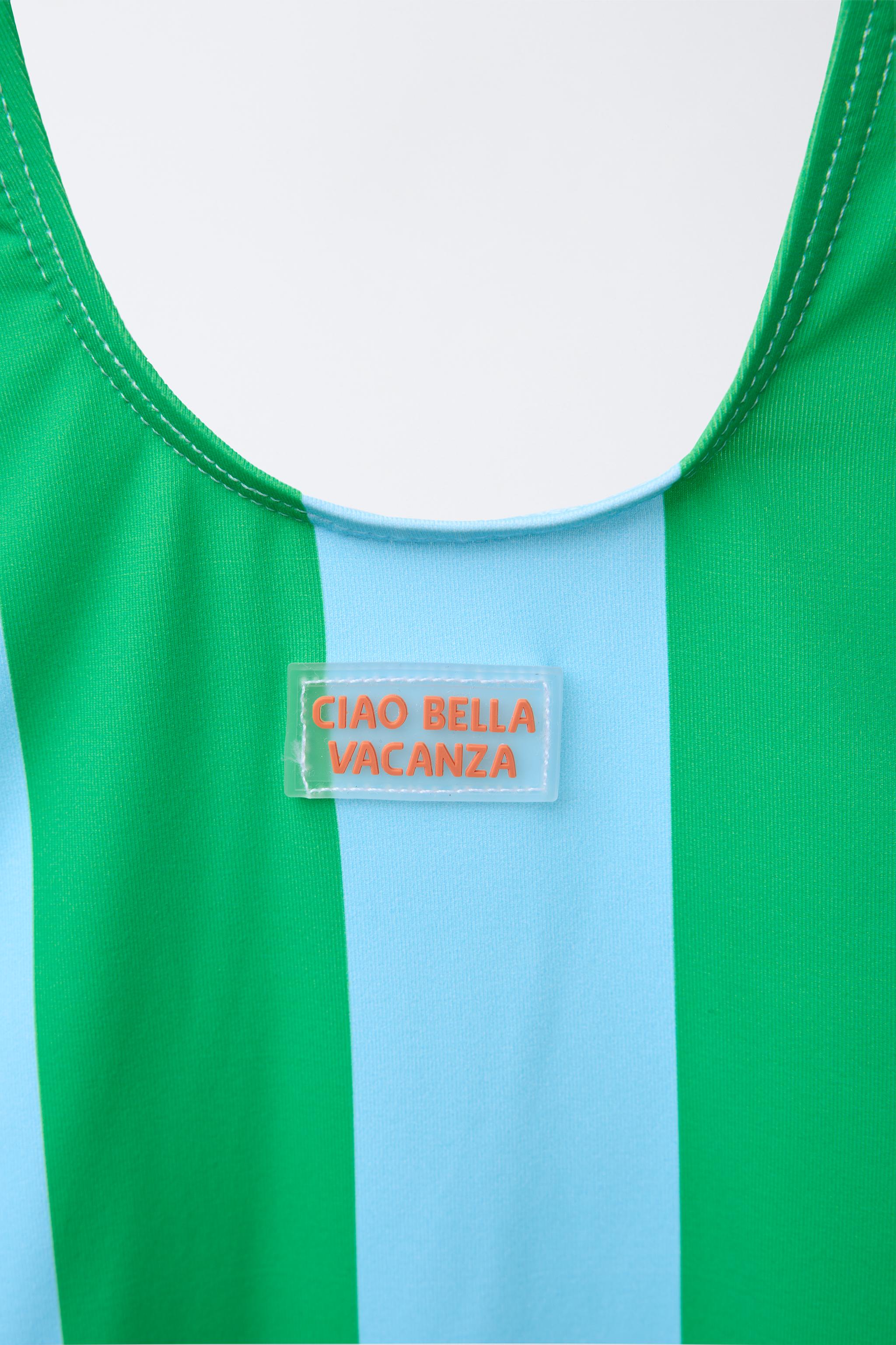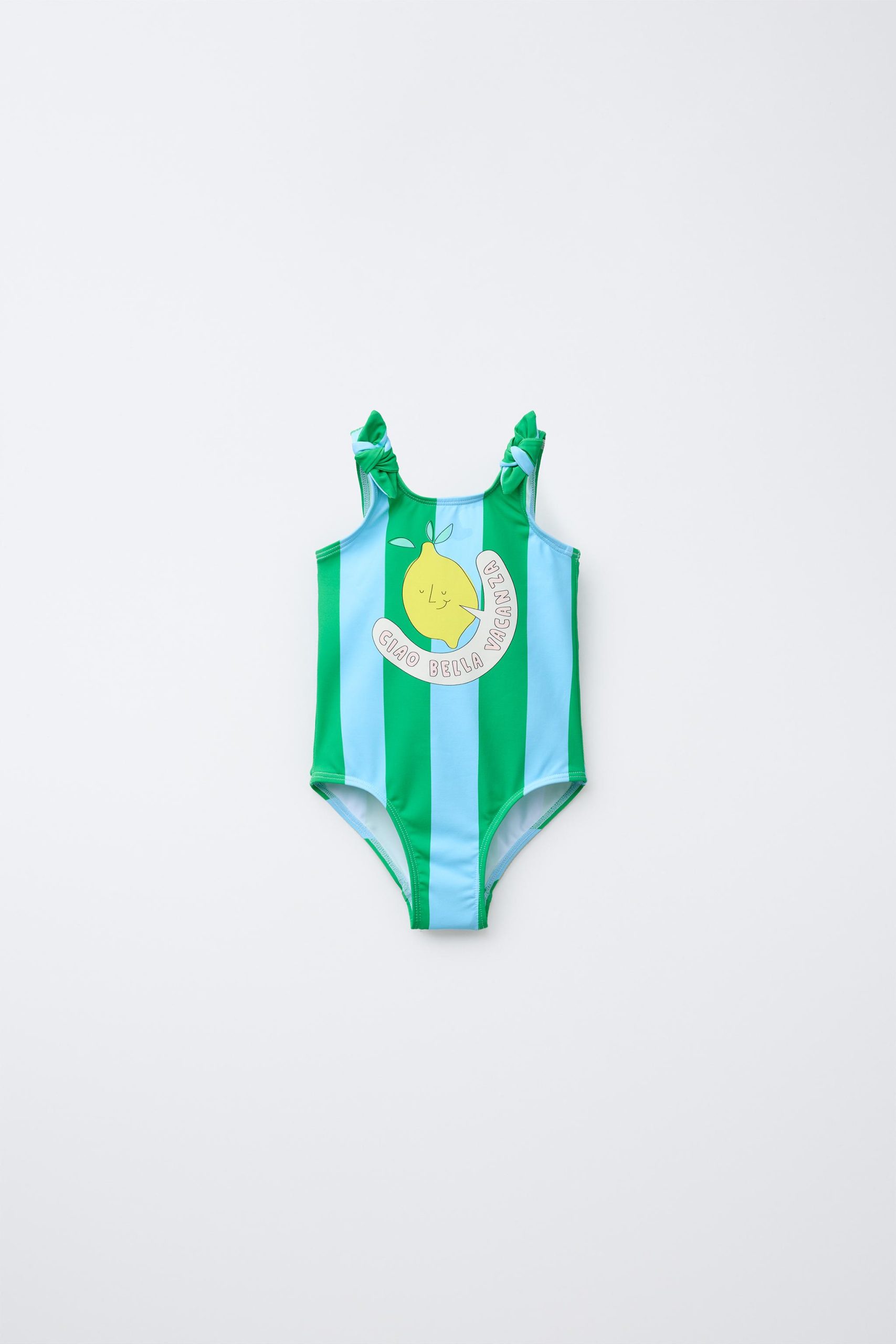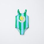 مایو با یقه دوچرخهای و بندهای تزئینی. جلو دارای چاپ لیمویی و راهراه است. پشت آن با برچسب چسبی تزئین شده است.