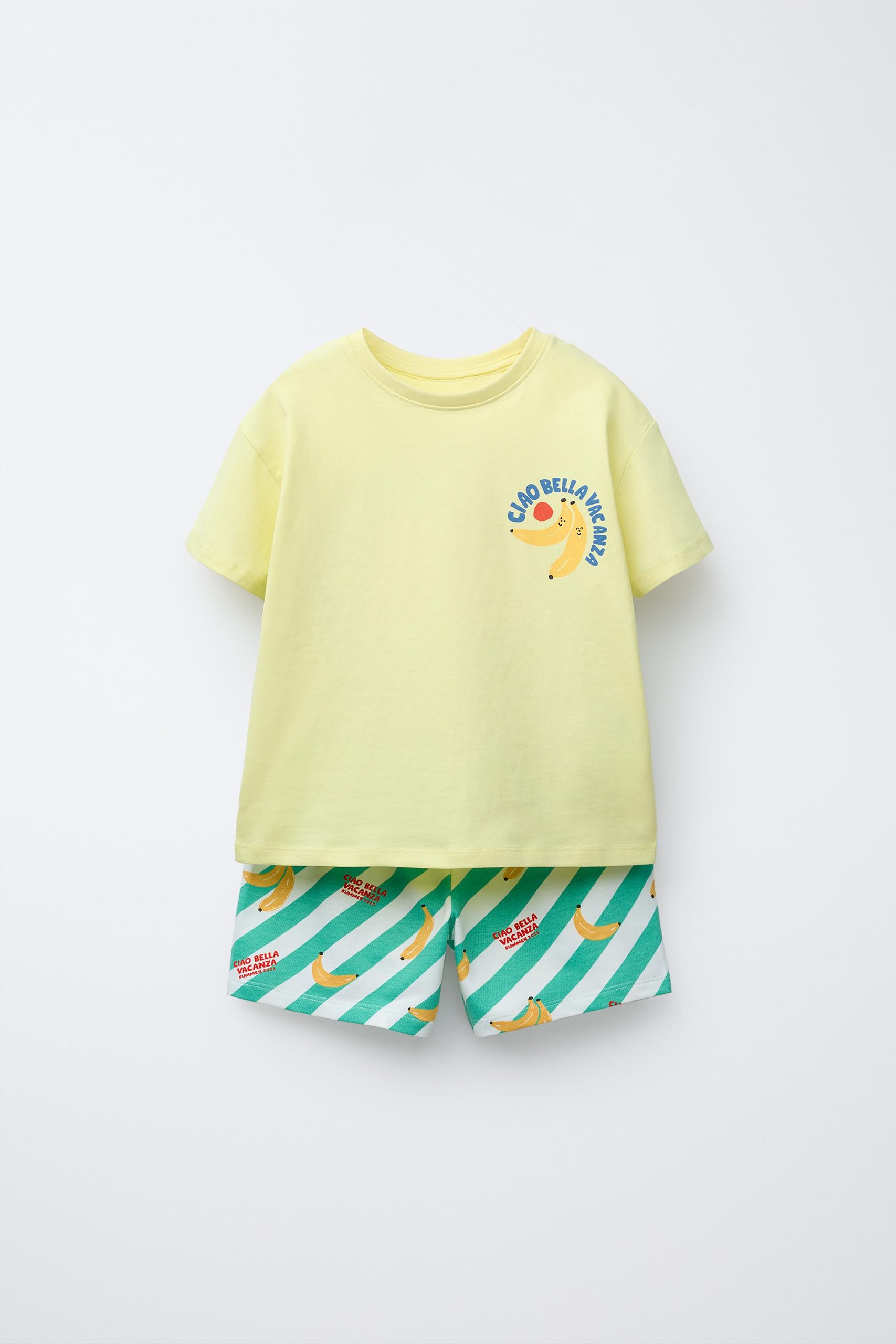 İki parçalı pijama takımı. Bisiklet yaka ve kısa kollu tişört. Elastik belli ve ön tarafı ayarlanabilir bağcıklı bermuda. Muz desenli.