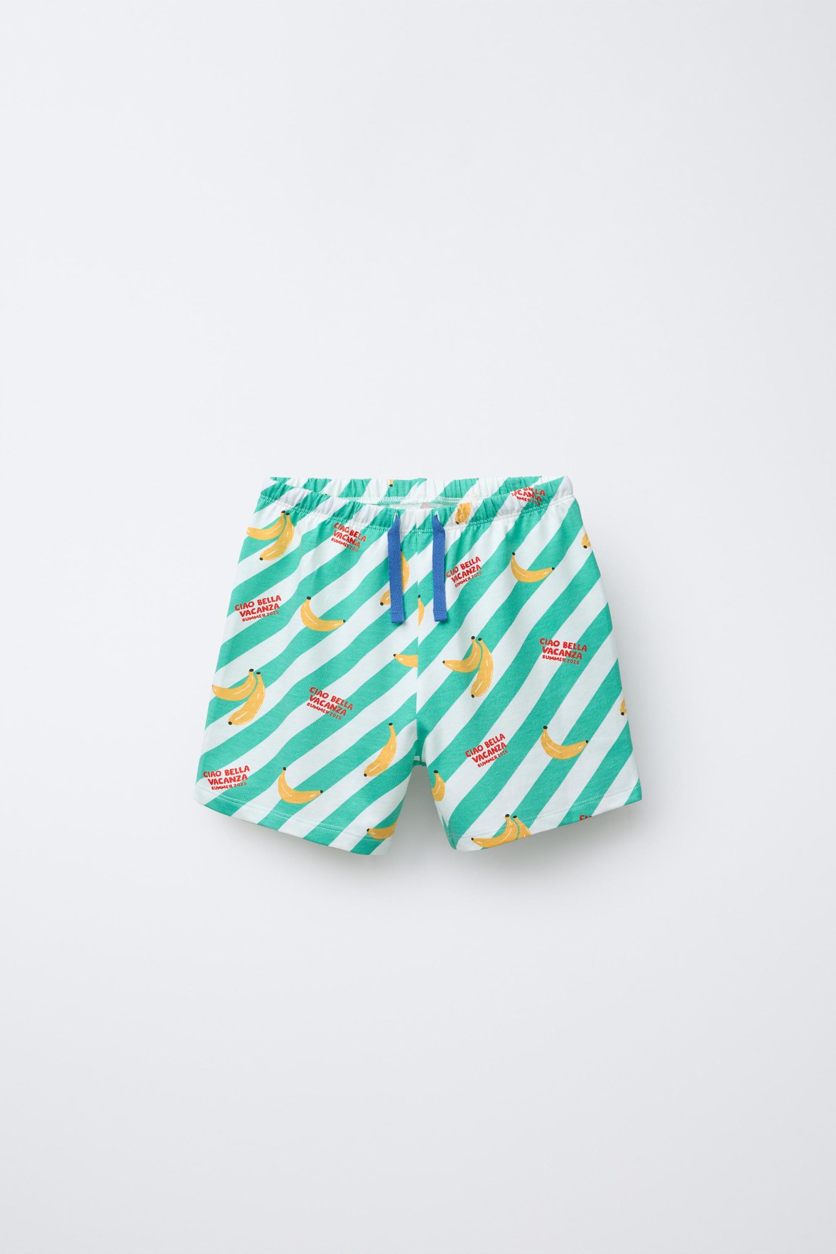 ست پیژامه دو تکه. تیشرت یقه گرد و آستین کوتاه. شلوارک برمودا با کمر کشی و بند قابل تنظیم در جلو. طرح موز.