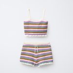 - İki parçalı takım. Düz yakalı ve askılı üst. Elastik belli ve önden ayarlanabilir bağcıklı bermuda şort. Etek ucu dalgalı. Çizgili baskılı. İç astarı mevcut.