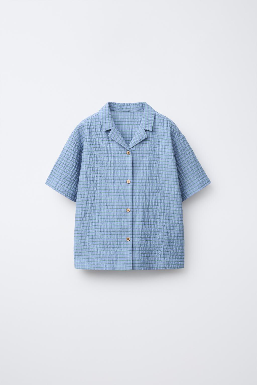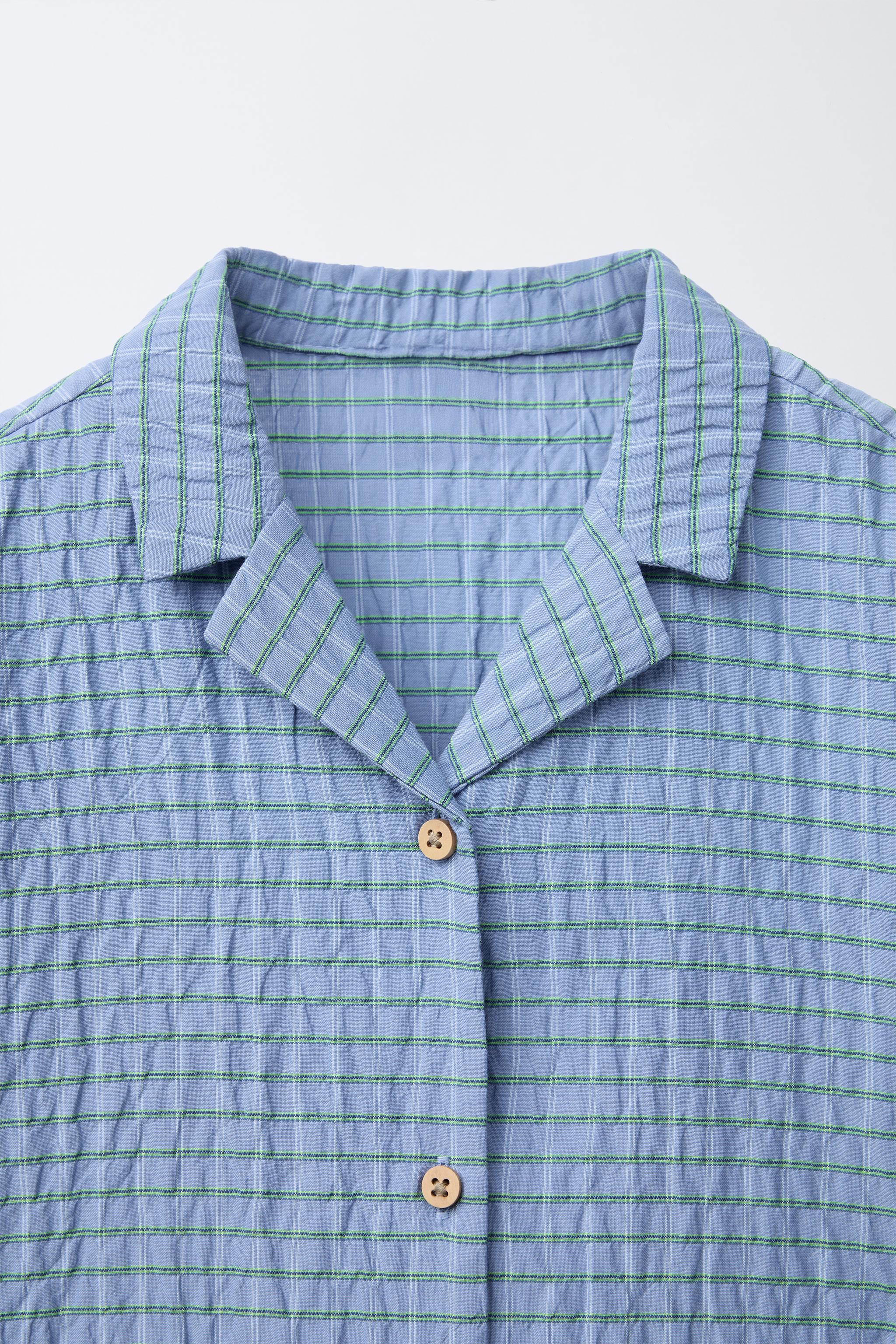 ست پیژامه دو تکه شامل بلوز یقهدار و آستین کوتاه است که از جلو با دکمه بسته میشود. شلوارک برمودا با کمر کشی و طرح چهارخانه طراحی شده است.