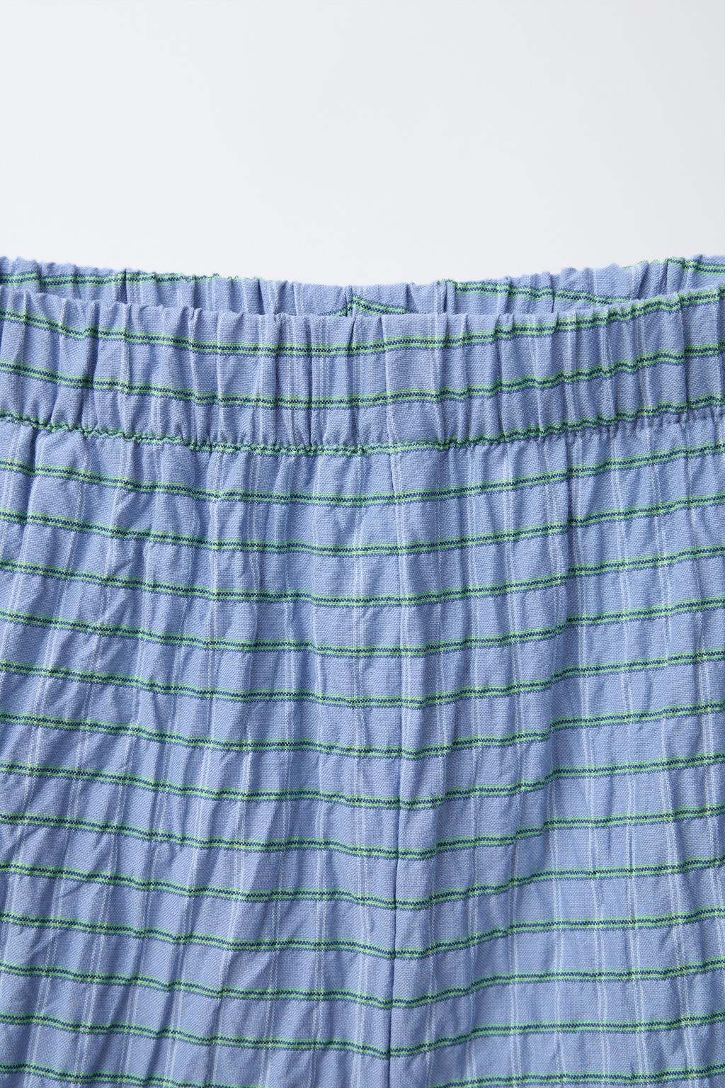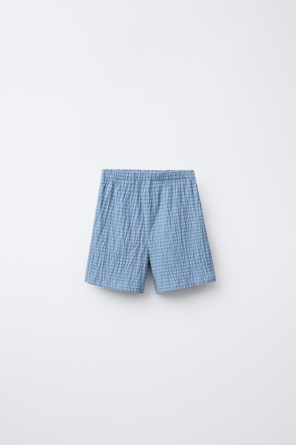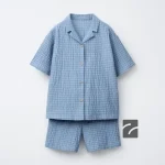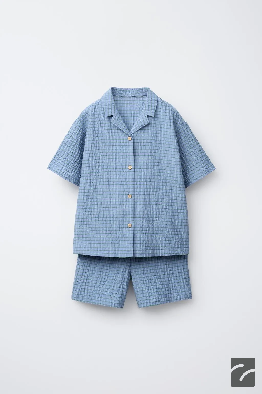 - İki parçalı pijama takımı. Gömlek yakalı ve kısa kollu üst. Önden düğmeli kapama. Elastik belli bermuda. Kareli baskılı.