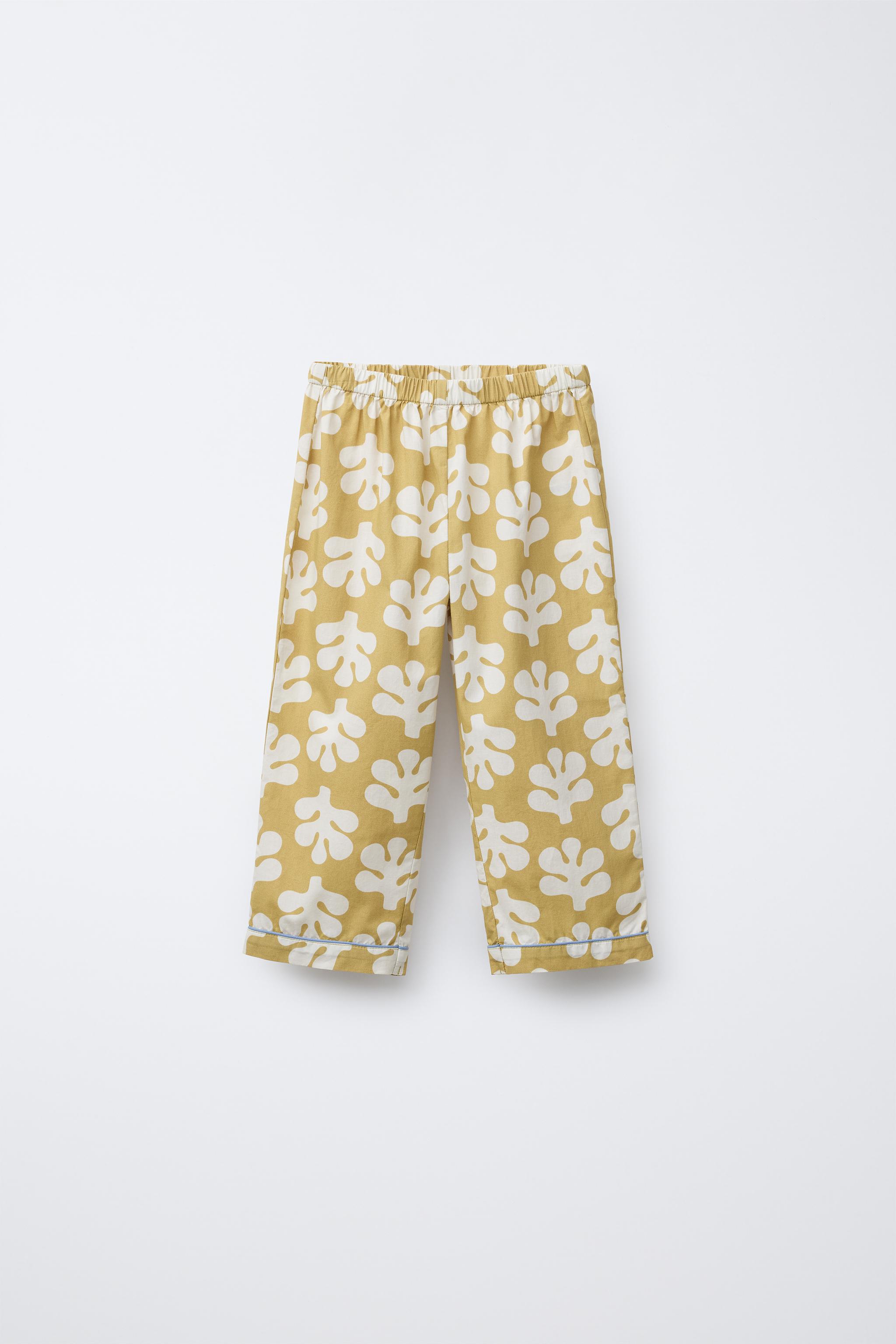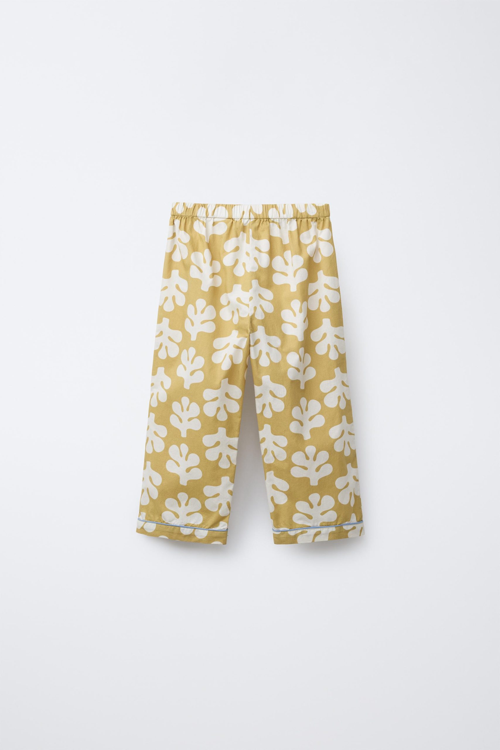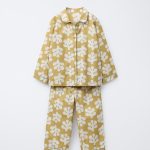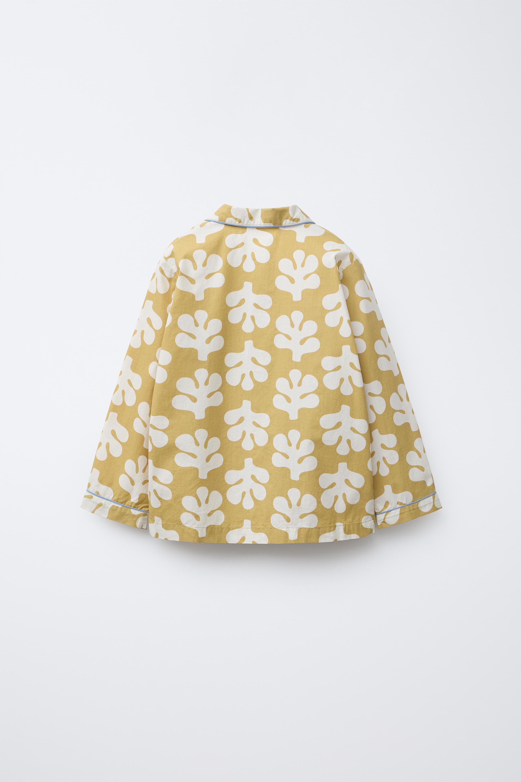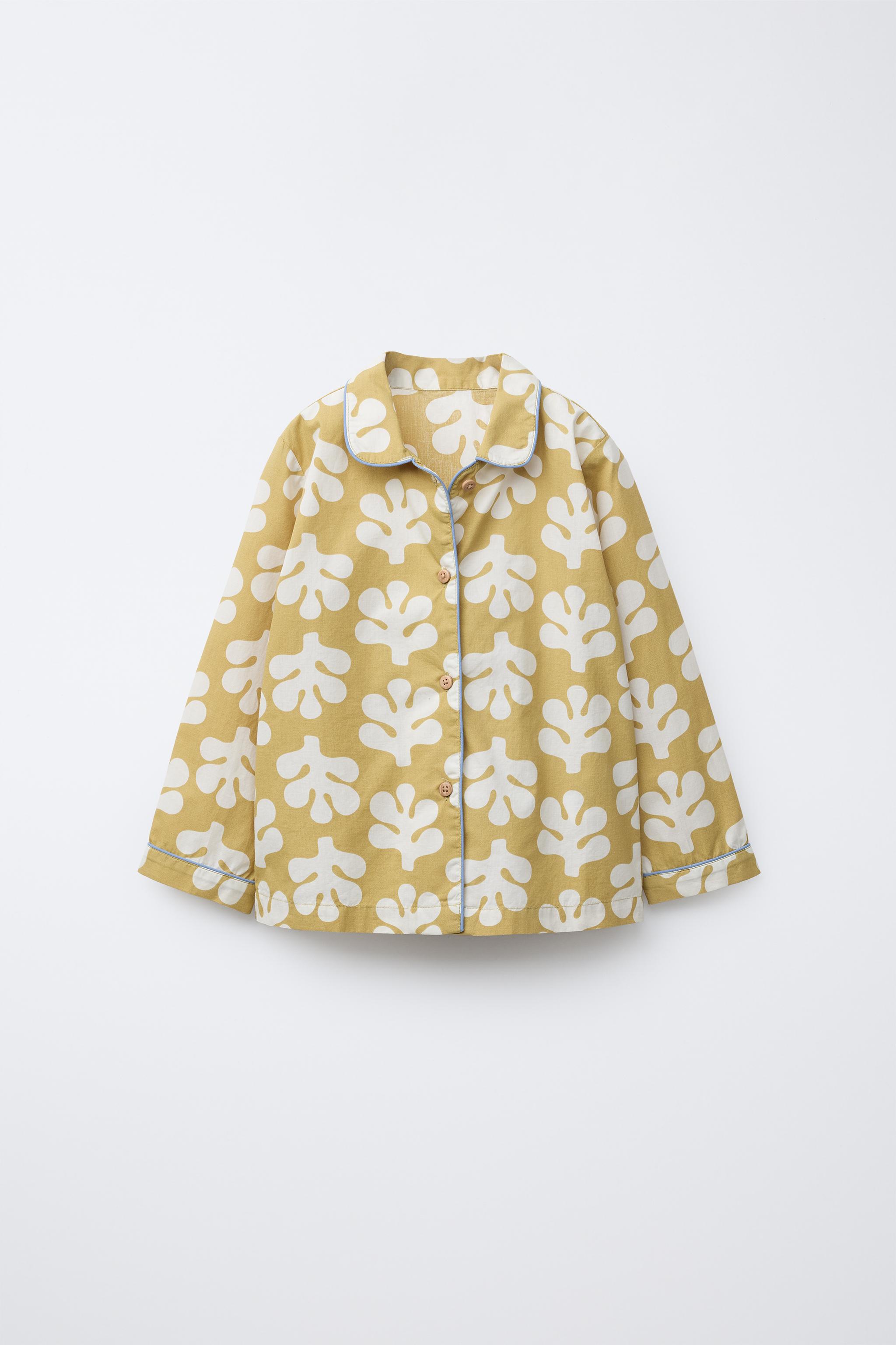 ست پیژامه دو تکه. پیراهن یقهدار و آستینبلند با دکمههای جلو. شلوار با کمر کشی. دارای طرح چاپی و جزئیات زنده با رنگهای متضاد.