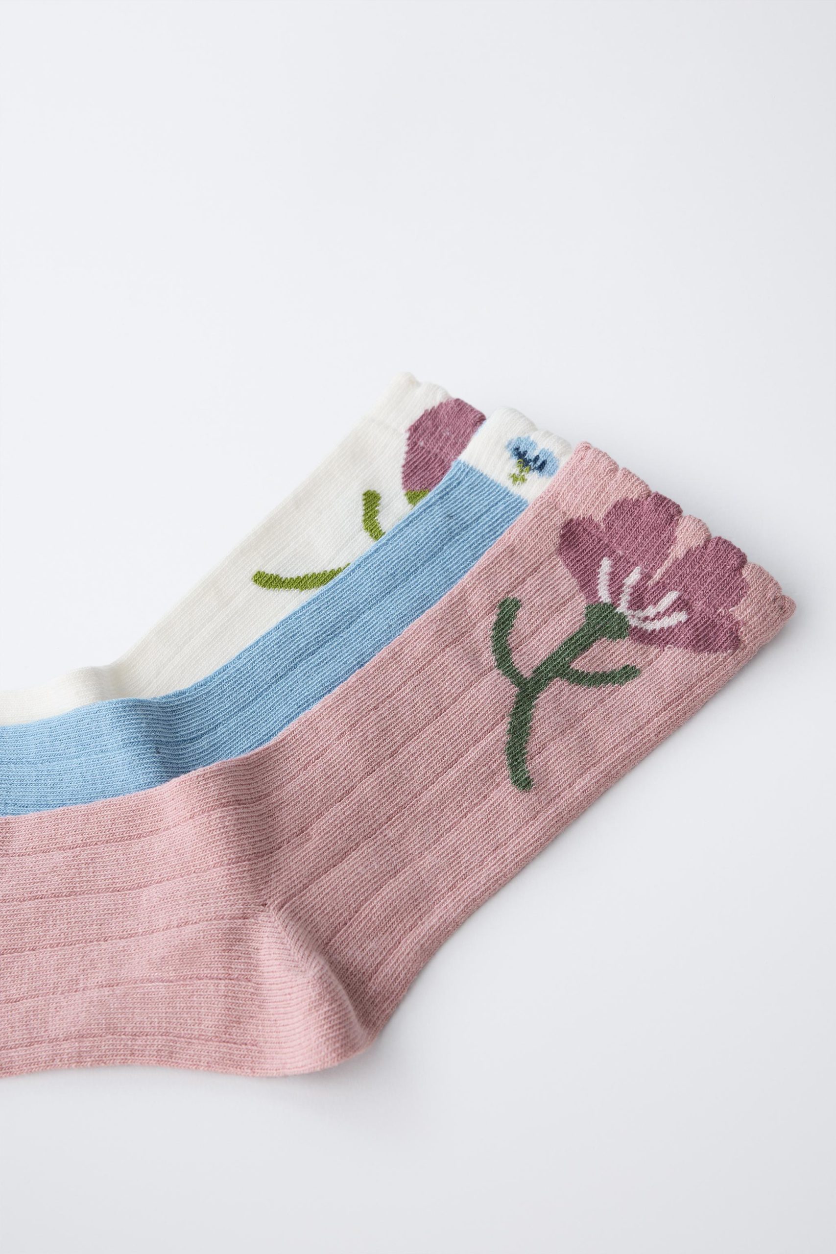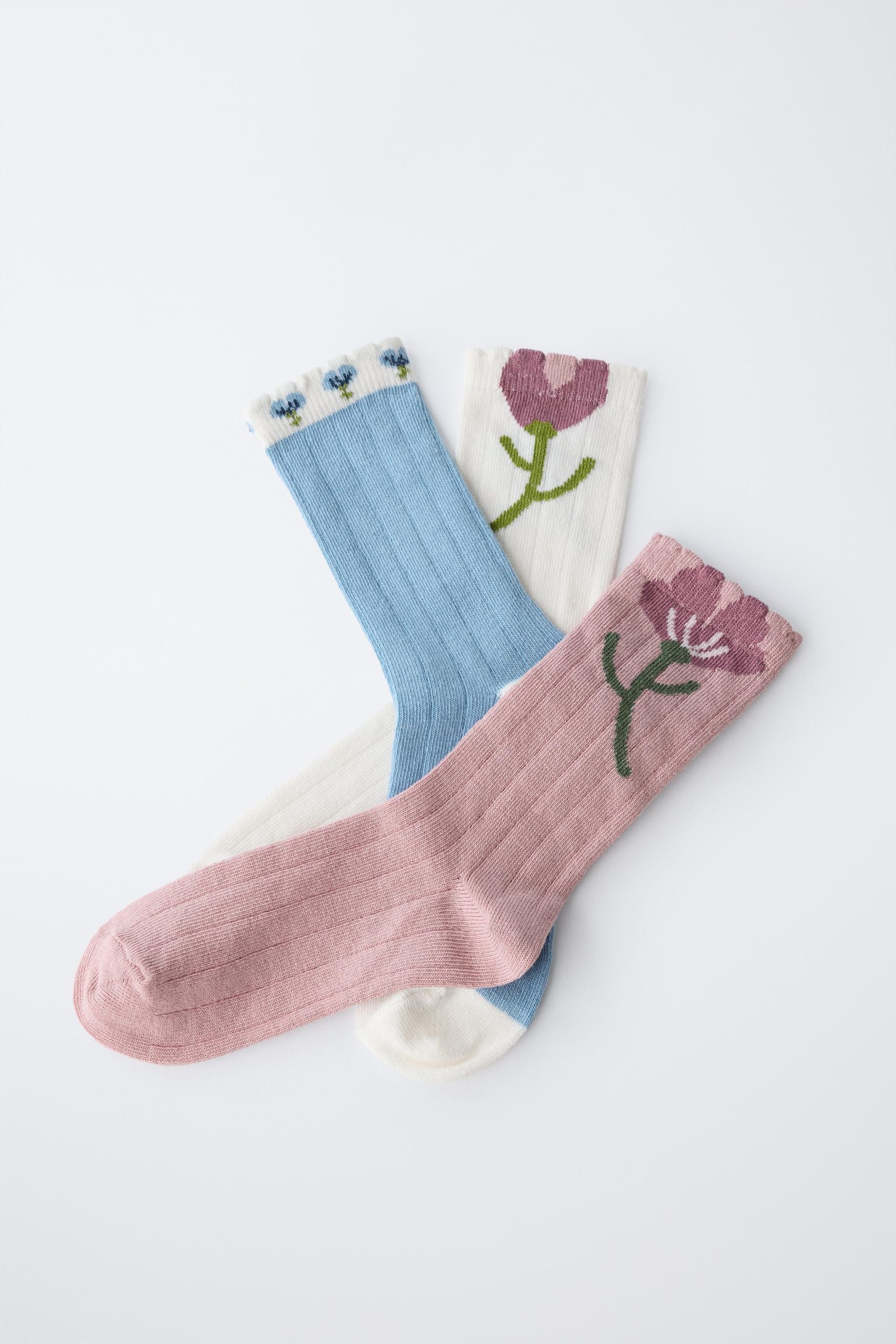 بسته سهتایی جوراب بلند. با طرح گل و لبههای موجدار.