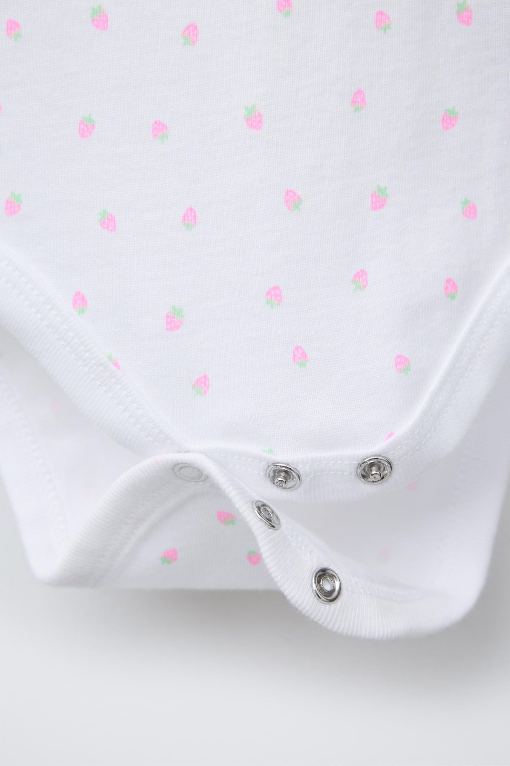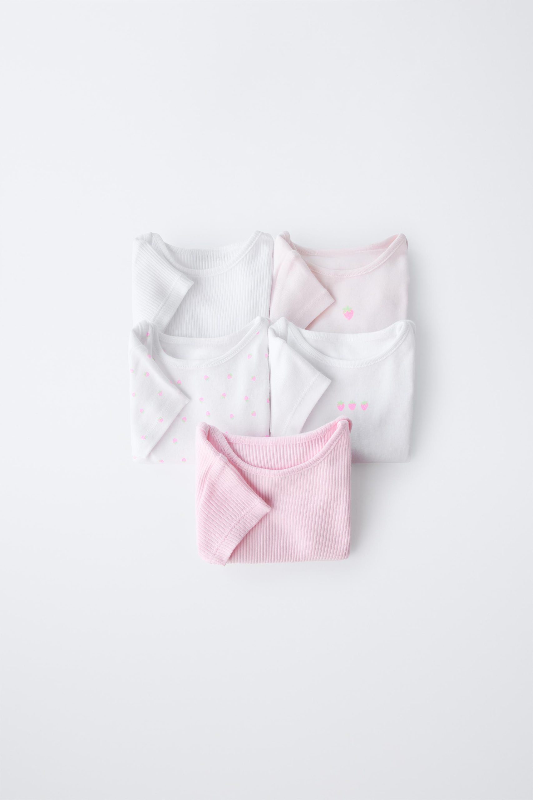 5’li bisiklet yaka ve kısa kollu body paketi. Alt kısmı çıtçıt kapamalı. Farklı çilek baskılı ve düz renkli.