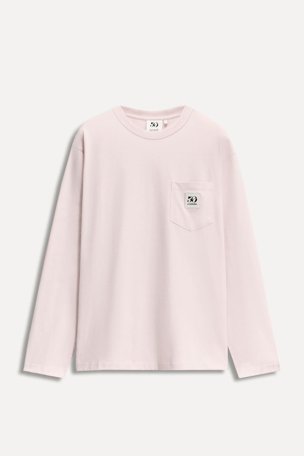 تیشرت تولید شده از الیاف پنبه. دارای یقه گرد و آستینهای بلند. جیب یقهای بر روی سینه. جزئیات دوخت برای سالگرد 50 سالگی.