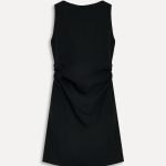 - Viskoz karışımlı iplikten üretilmiş kısa elbise. Kayık yaka ve kolsuz. Büzgülü kumaş detayı. Yan dikişte gizli fermuarlı kapama.