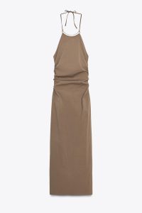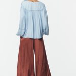 بلوز آستین بلند با یقه v و بندهای گرهدار با جزئیات آجور در رنگ هماهنگ.