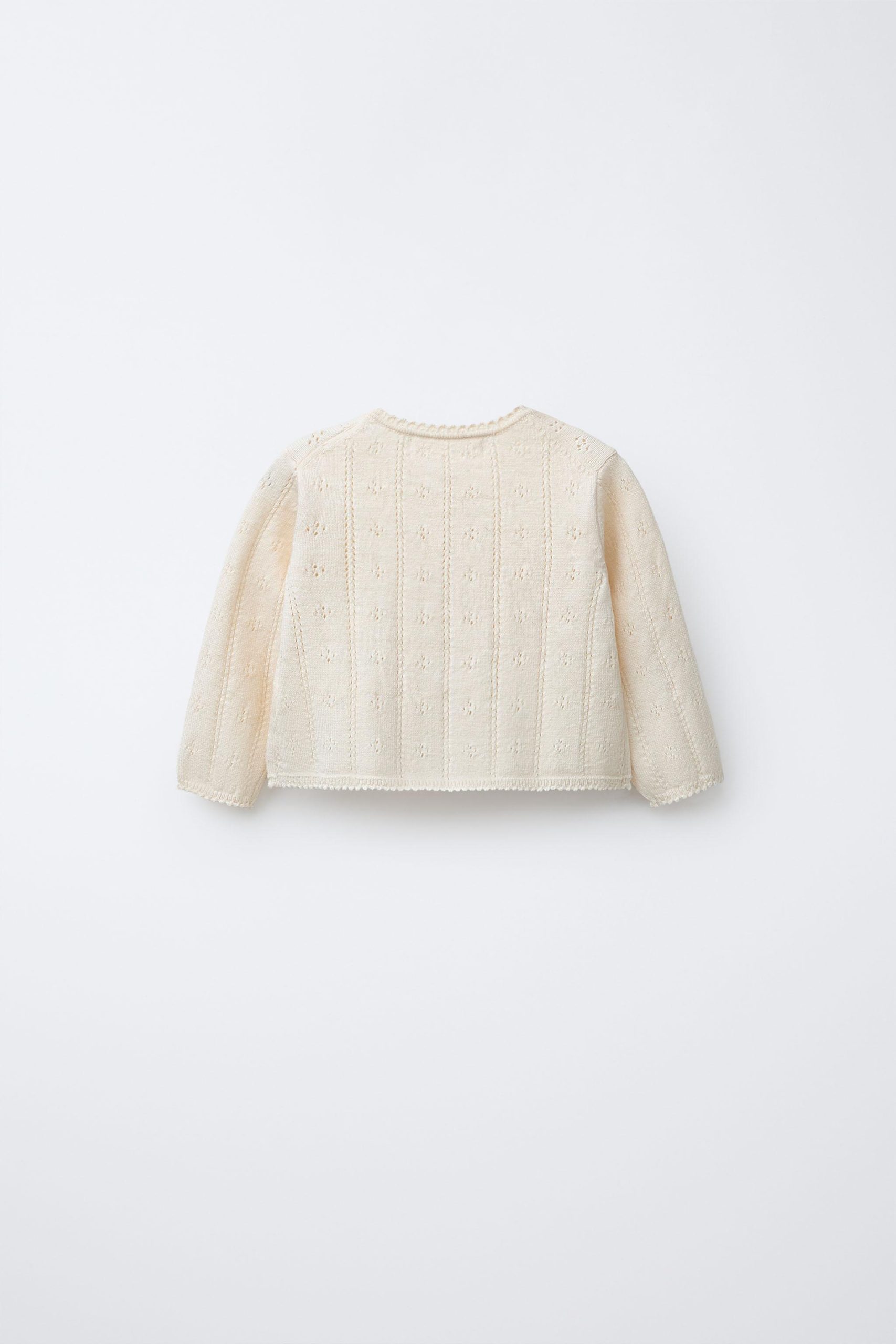 ژاکت با یقه دایرهای و آستینهای بلند. دارای بسته شدن با دکمه در جلو. با جزئیات بافتنی و تزئینات گلدوزی شده. دارای لبههای موجدار.