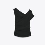 Elastik kumaştan üretilmiş top. Asimetrik yaka ve kollar. Büzgü detaylı.