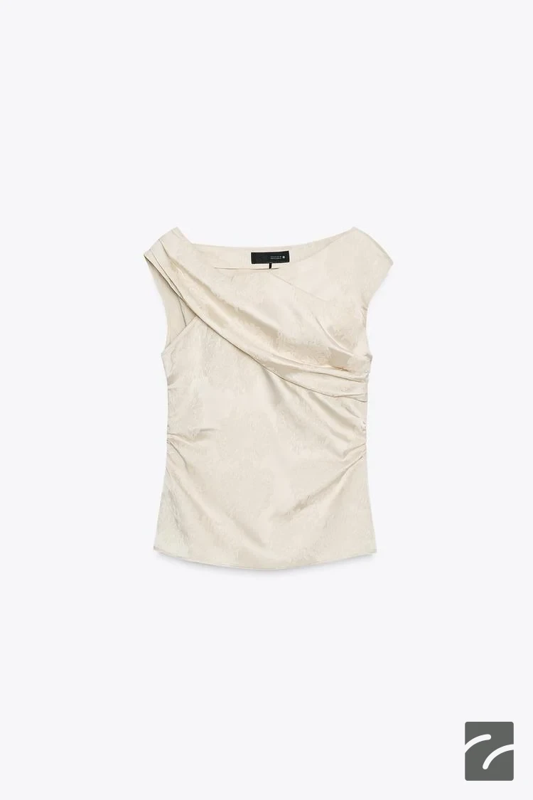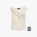 - Asimetrik yakalı ve kollu üst. Büzgü detaylı. Yan dikişte gizli fermuar kapamalı.