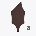 Poliamid karışımlı iplikten üretilmiş body. Asimetrik yakalı ve geniş askılı. Alttan çıtçıtlı kapamalı.