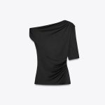 توپ تولید شده از نخ ترکیبی پلیآمید. یقه نامتقارن، بدون آستین و با آستین کوتاه. دارای جزئیات دراپه و اپلکه فلزی در ناحیه شانه.