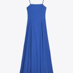 Düz yaka ve ayarlanabilir ince askılı midi elbise. İç astarı kombine edilmiştir. Asimetrik etek ucu. Arkası dikişli gizli fermuarlı kapamalıdır.