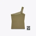 - Asimetrik yakalı, geniş askılı, altın rengi aksesuarlı ve delikli top.