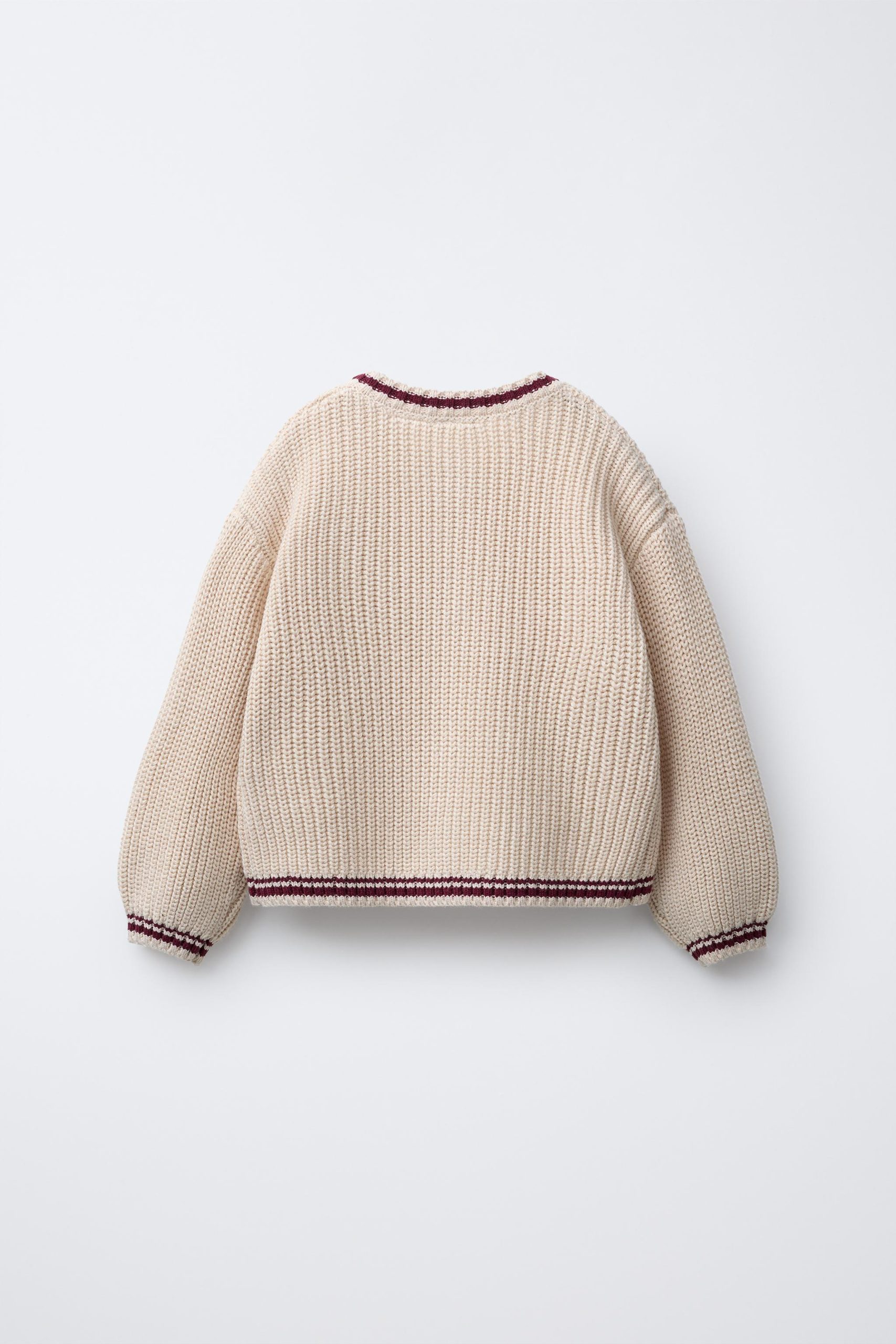 • Bisiklet yaka ve uzun kollu örgü hırka. Önden düğmeli. Göğüs kısmında ayı işlemeli detay.