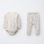 - İki parçalı takım. Bisiklet yaka, uzun kollu body. Omuz ve alt kısmında çıtçıt düğme kapama. Önünde ayıcık yama aplikasyonu ve arkasında etiketi bulunur. Elastik belli tayt. Ayıcık baskılı. %95 pamuklu kumaş.
