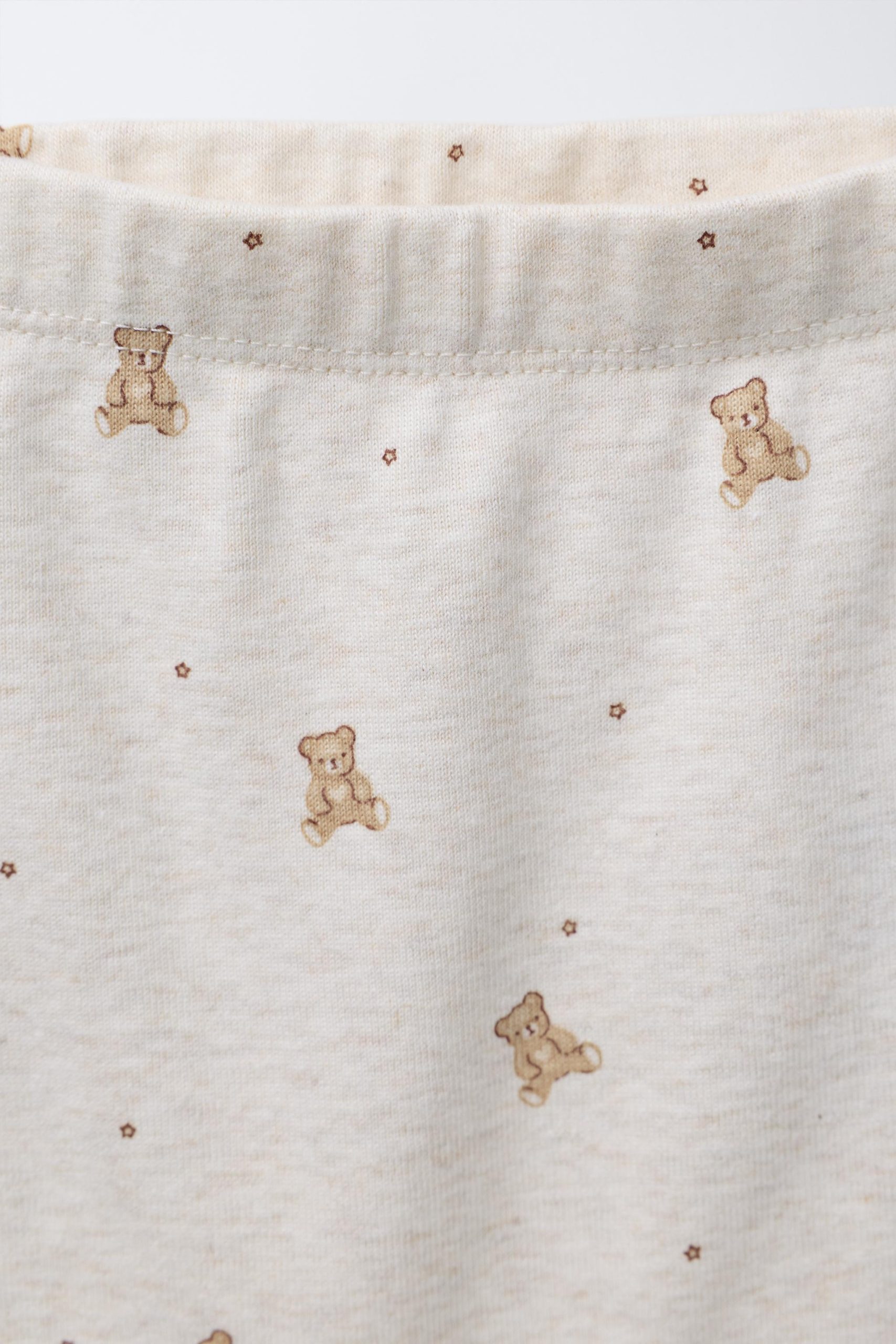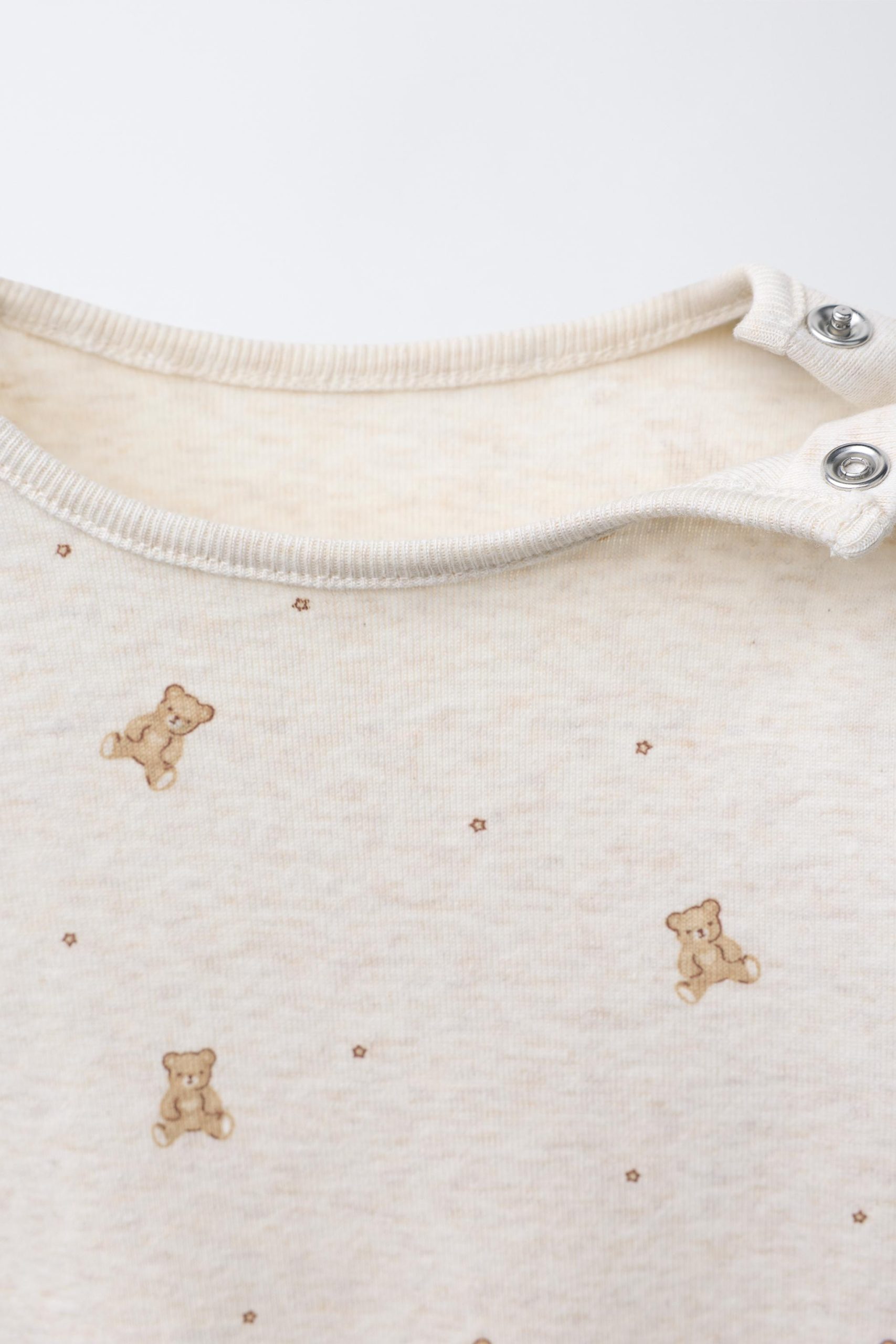 İki parçalı takım. Bisiklet yaka, uzun kollu body. Omuz ve alt kısmında çıtçıt düğme kapama. Önünde ayıcık yama aplikasyonu ve arkasında etiketi bulunur. Elastik belli tayt. Ayıcık baskılı. %95 pamuklu kumaş.