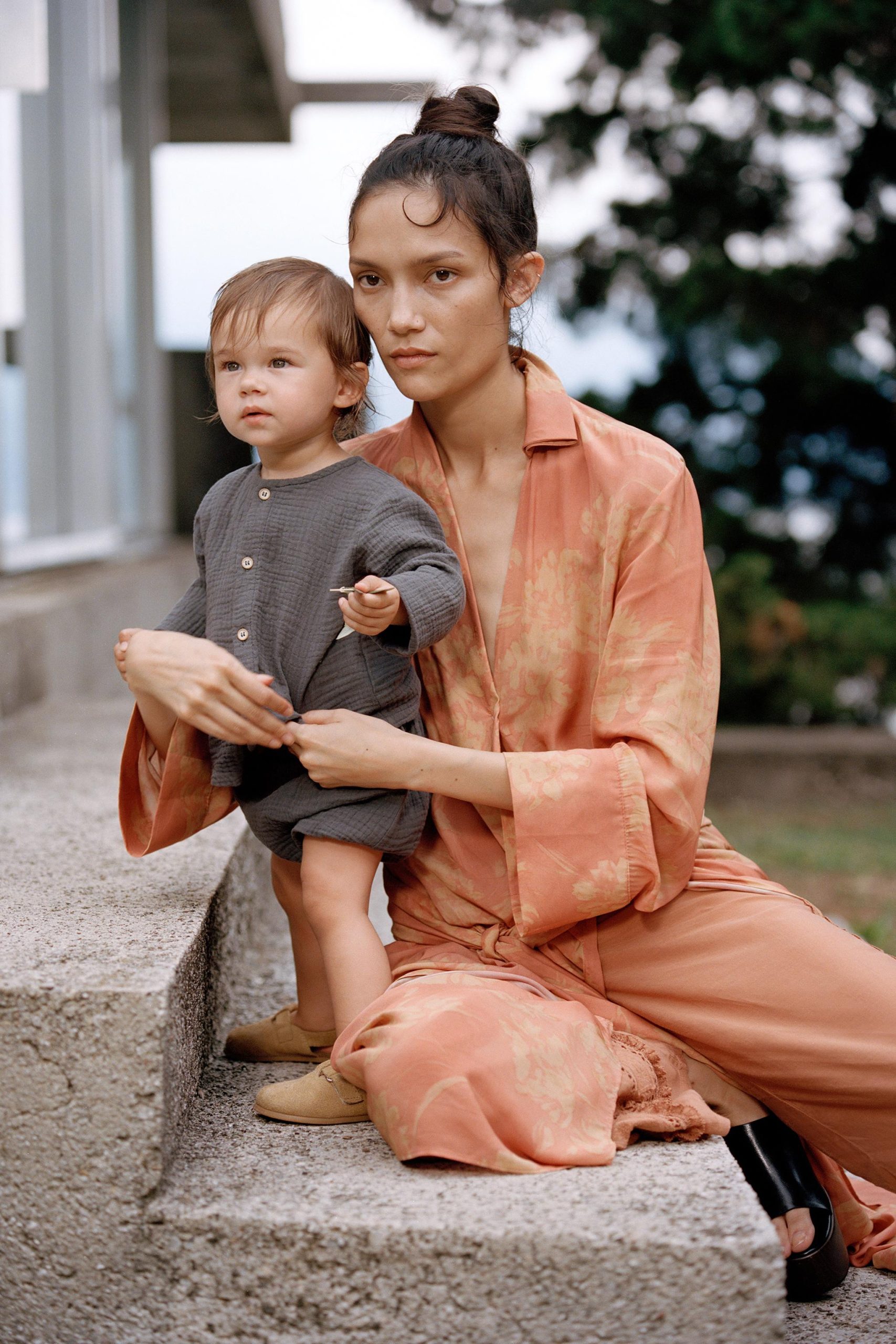 پیراهن بامبو با یقه دوچرخهای و آستینهای بلند. دارای بسته شدن دکمهای در جلو.