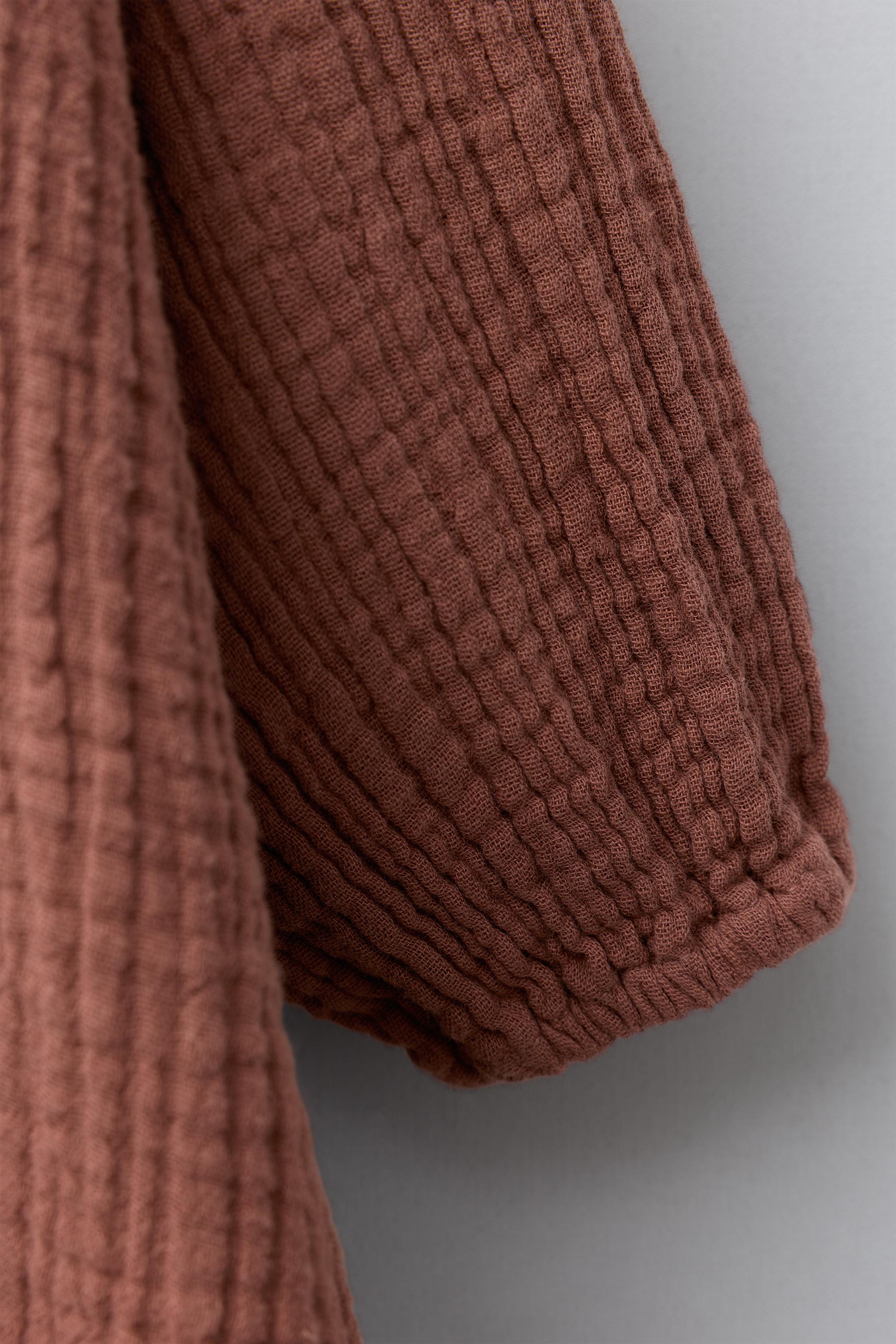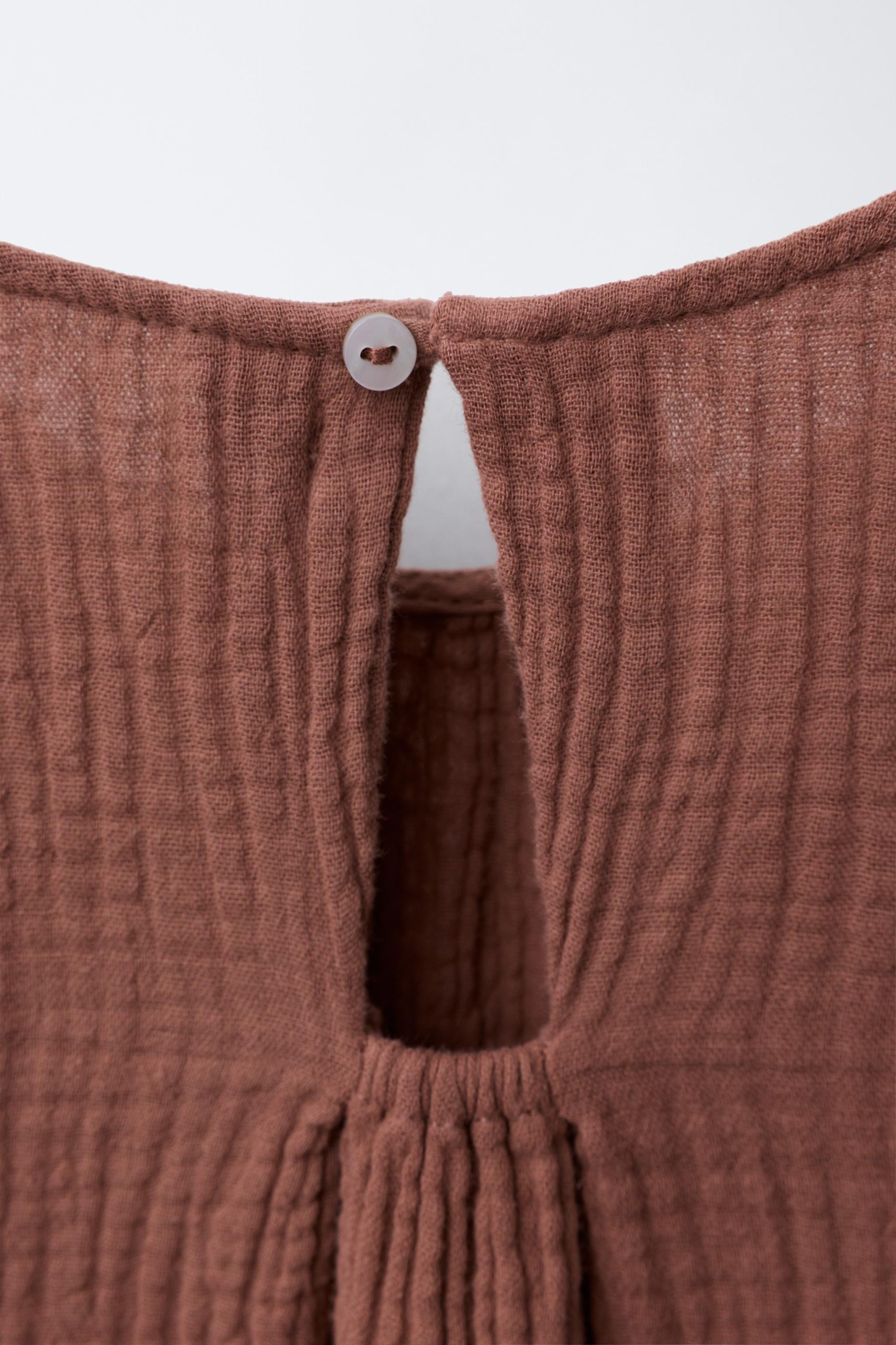 پیراهن بلند آستیندار با یقه گرد و مچ کشی. دارای دکمه در پشت و چاک بستهشونده.