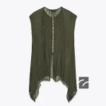 - Viskoz kumaştan üretilmiş, yarı transparan gömlek. Bisiklet yakalı ve kolsuz. Asimetrik etek ucu. Önden düğme kapamalı.