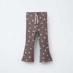 - Elastik belli, önünde bağcık aplikeli, çan paça pantolon. Kıvrımlı etek ucu. Baskılı. %50 pamuklu kumaş.