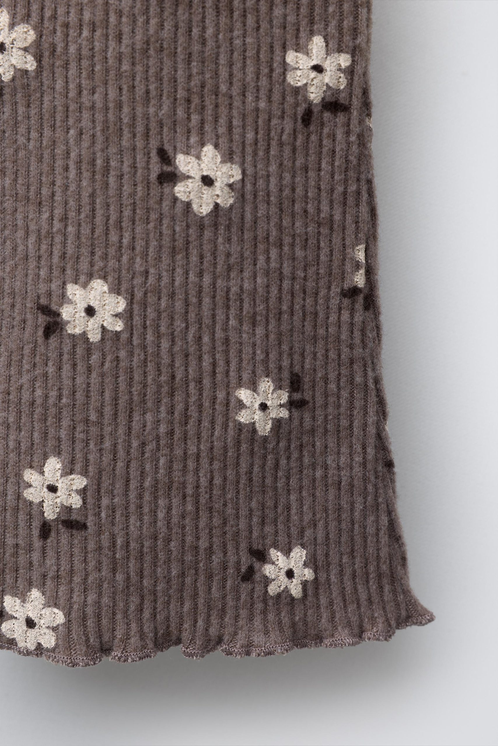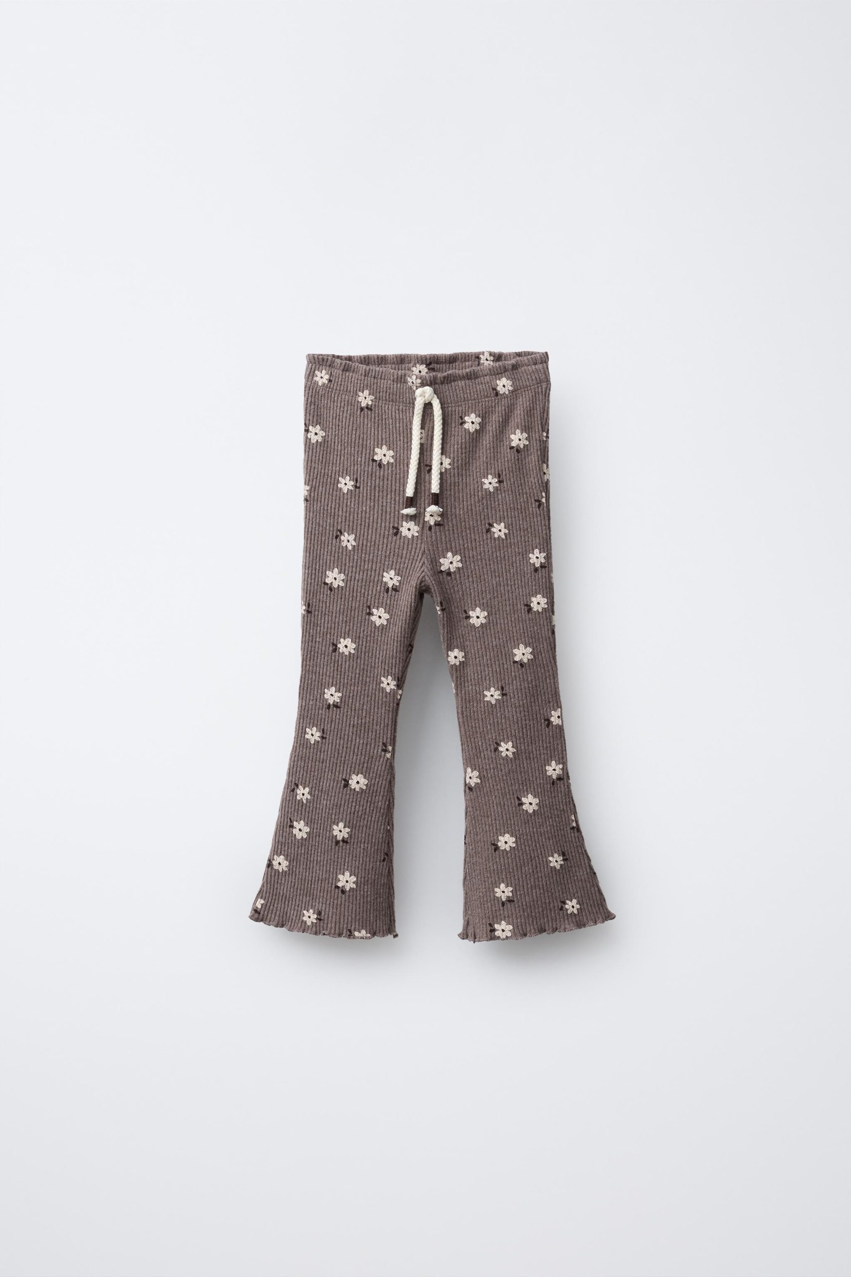 Elastik belli, önünde bağcık aplikeli, çan paça pantolon. Kıvrımlı etek ucu. Baskılı. %50 pamuklu kumaş.