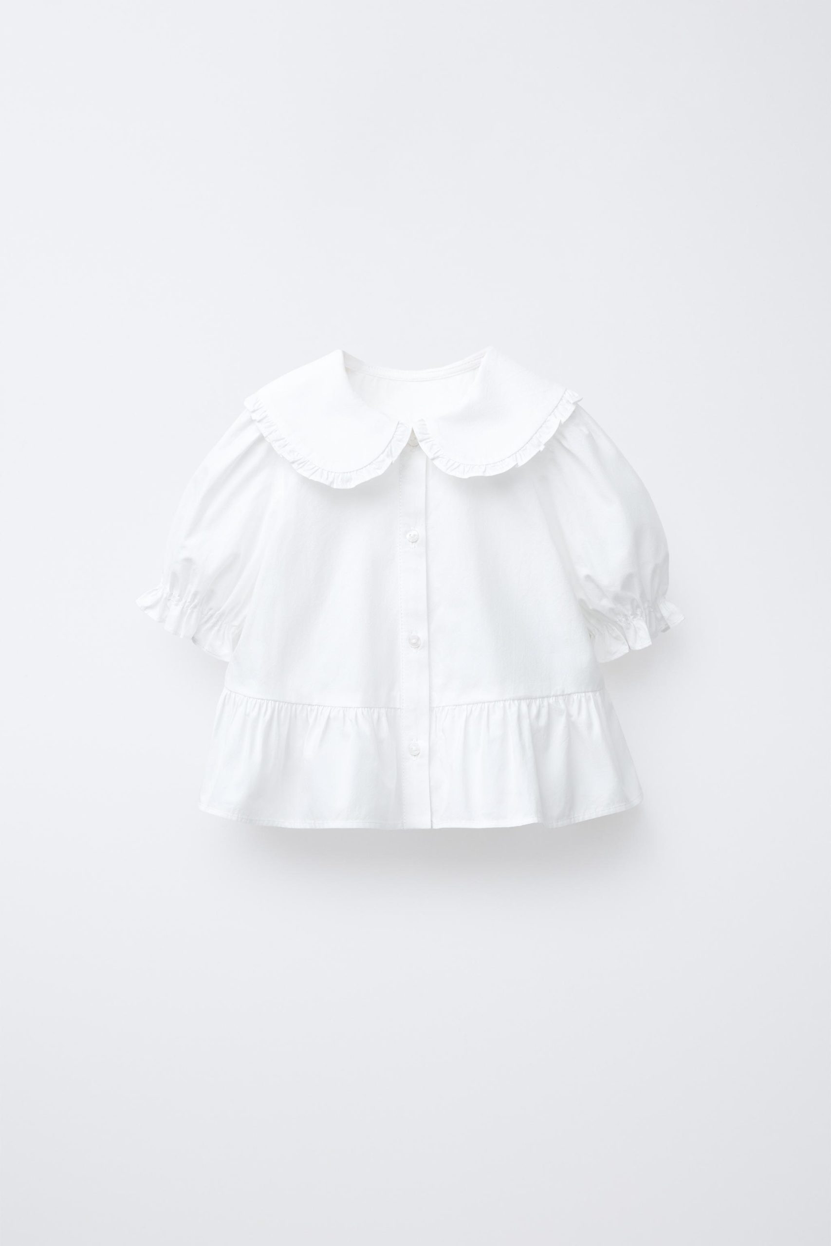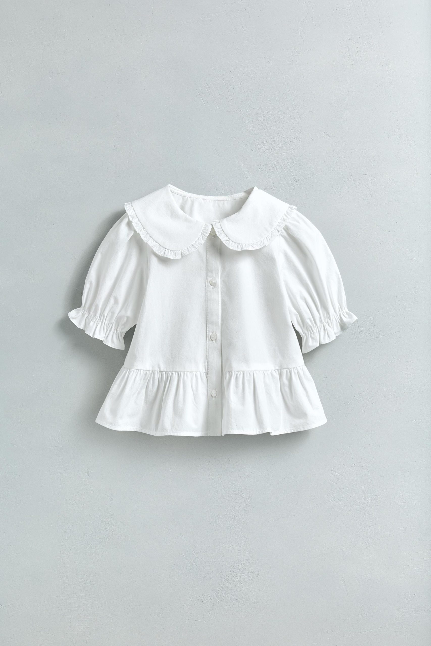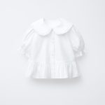 - Bebe yaka, kısa kollu ve lastikli gömlek. Önden düğmeli. Etek ucu fırfırlı.