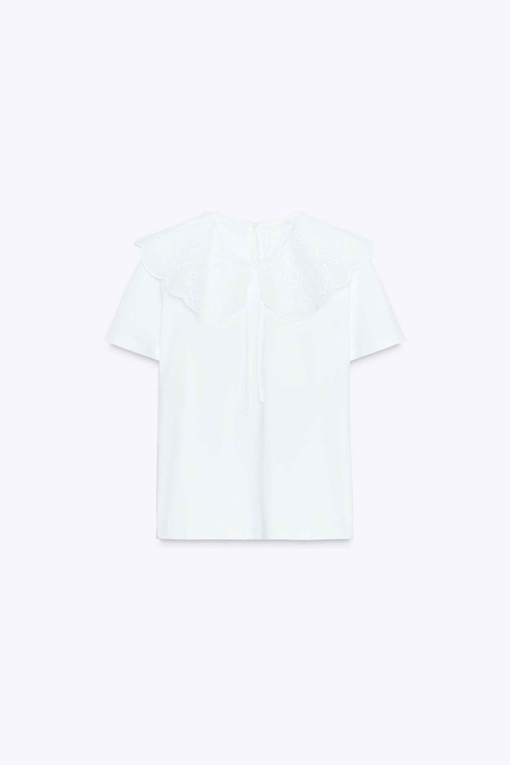 - Ton sür ton nakışlı bebe yaka ve kısa kollu t-shirt. Göğüste yama cep. Arkası açık ve düğmeli.