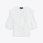 - Ton sür ton kombine işlemeli, bebe yaka gömlek. Büzgülü kol. Önü yırtmaçlı ve düğmeli.