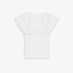 - Fitilli kumaştan üretilmiş tişört. Ton sür ton fırfırlı ve işlemeli, kombinlenebilir bebe yaka. V yakalı ve kolsuz.