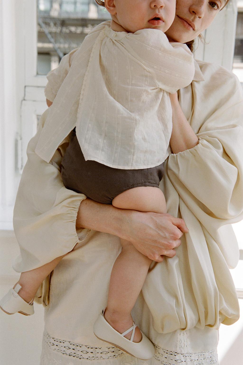 بلوز آستین بلند با یقه بیسیکلت و کشباف. پشت بلوز با دو دکمه متقاطع بسته می‌شود. یقه آن دارای جزئیات دانتل است.