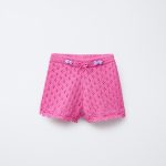 Önü kurdele aplikeli, elastik belli, triko bermuda. Önü boncuklu ve paçası fırfırlı.