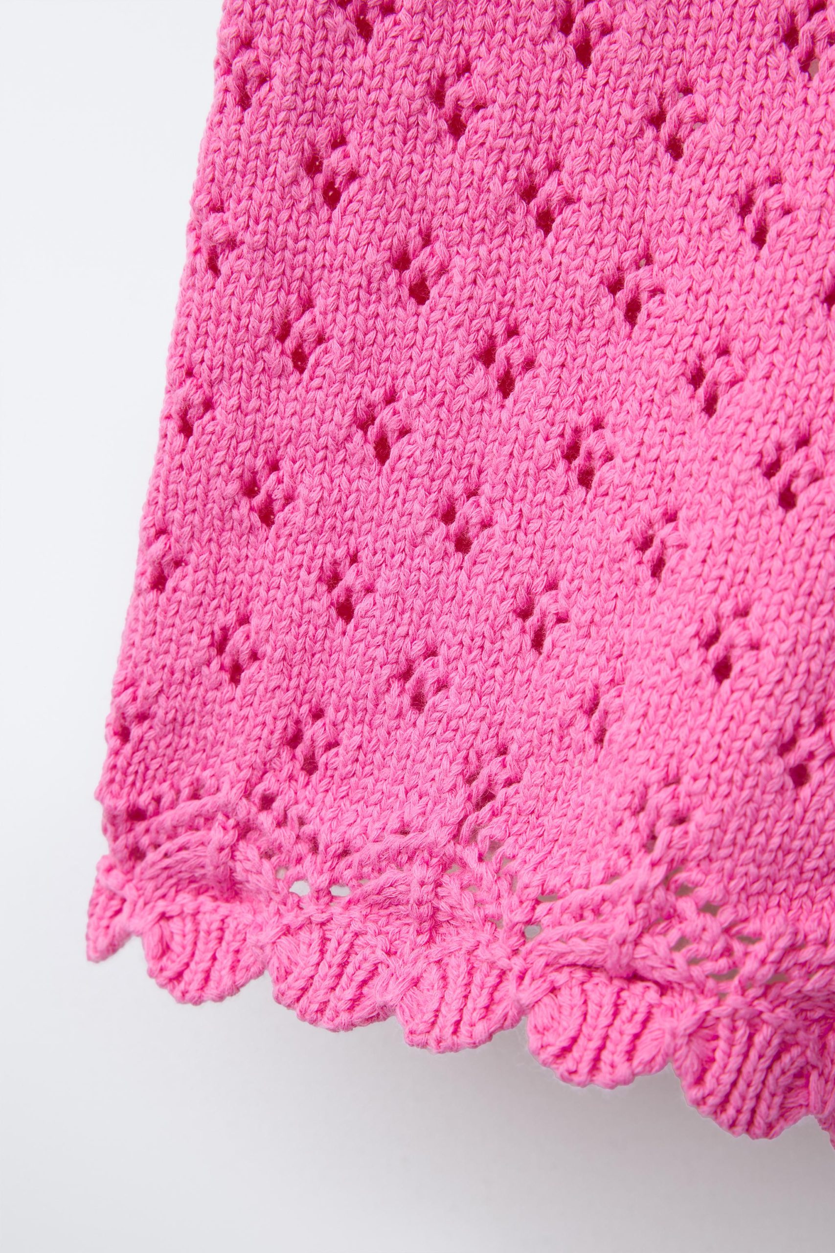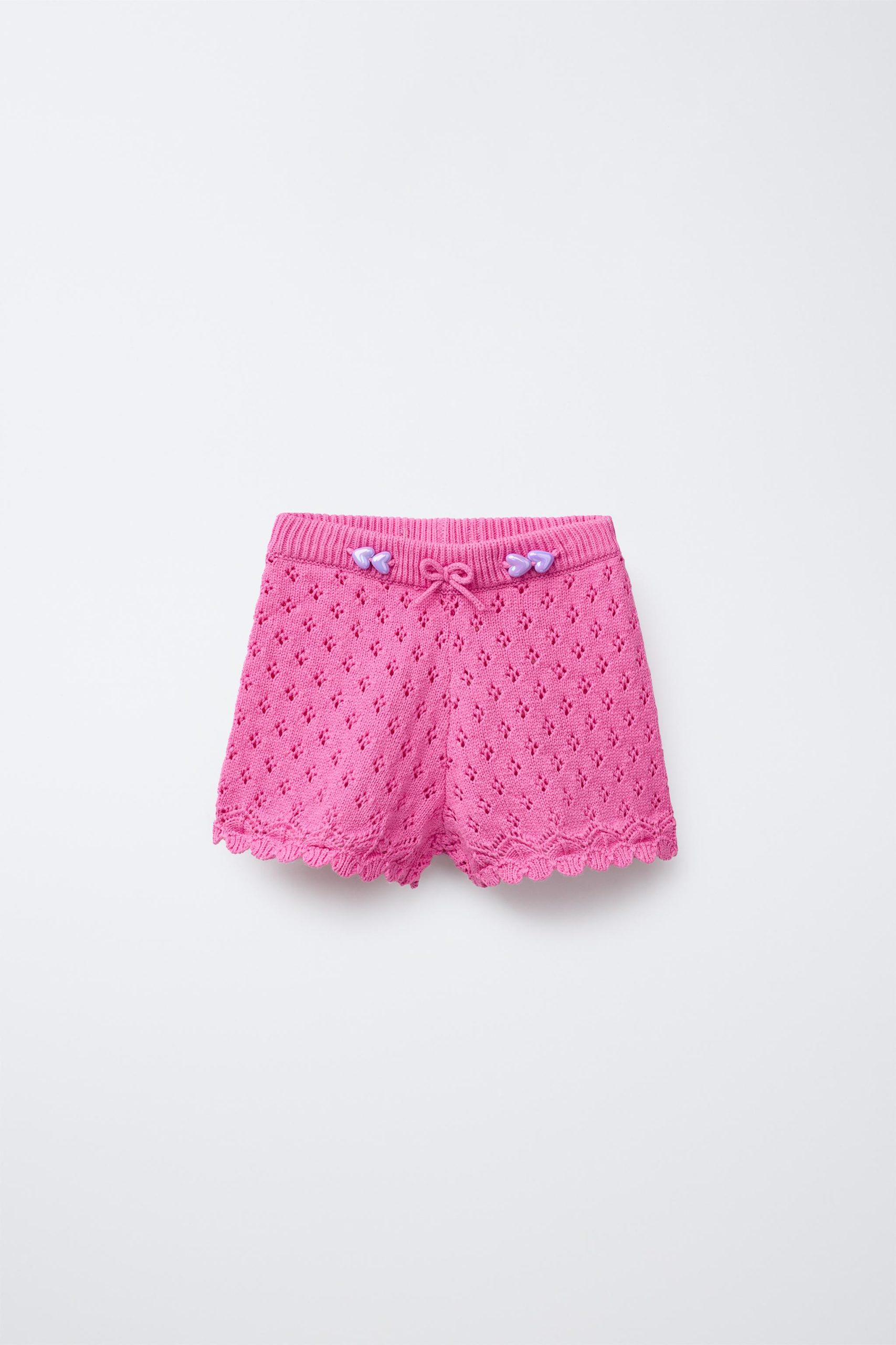 شلوارک بافتنی، با کمر کشی و جلو با تزیینات روبان. جلو با دانههای تزئینی و لبههای فری باف شده.