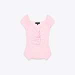 تیشرت یقه گرد و کوتاهمچ با جزئیات چیندار در جلو. با دکمههای پوشیده شده از همان رنگ در جلو بسته میشود.