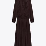 پیراهن بلند یقه باز و قابل تنظیم با بند، دارای یقه V. آستین‌های بلند با مچ. جزئیات پارچه جمع‌شده. لبه دامن صاف. بسته شدن با دکمه از جلو.