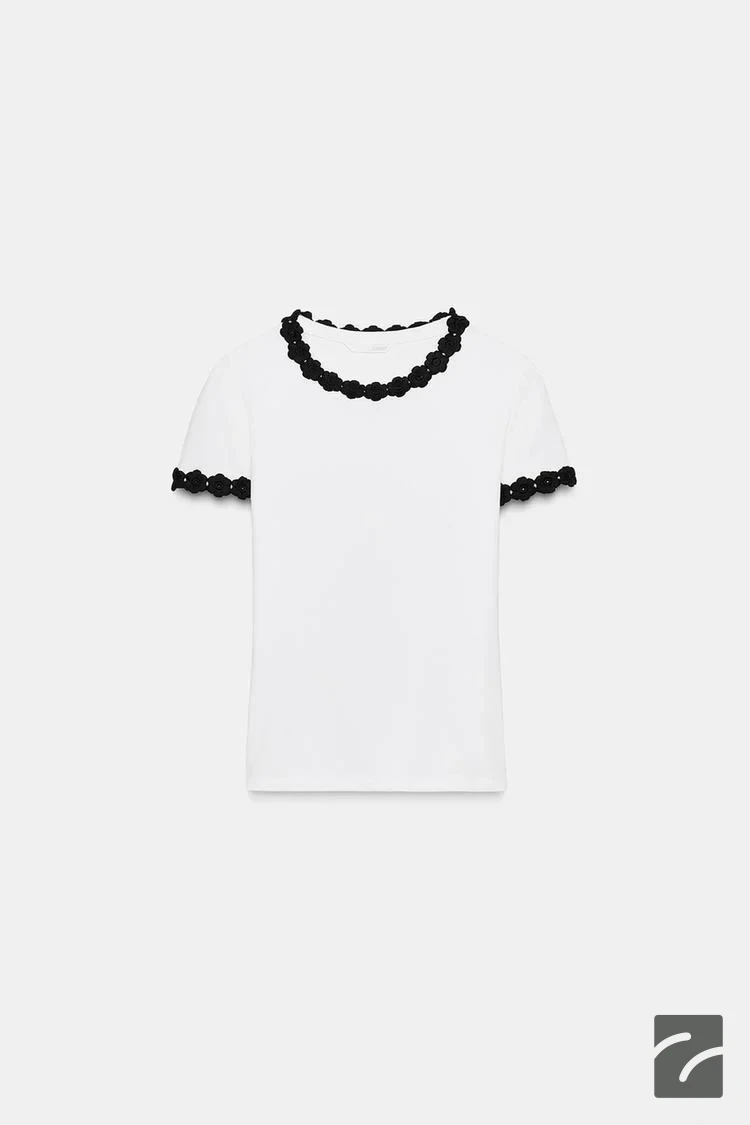 Pamuk karışımlı iplikten üretilmiş t-shirt. Bisiklet yaka ve kısa kollu. Çiçek şeklinde kontrast detaylı aksesuar.