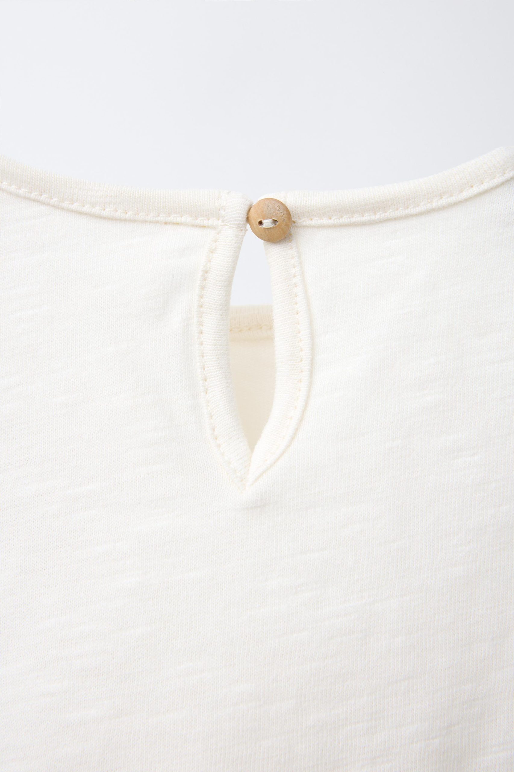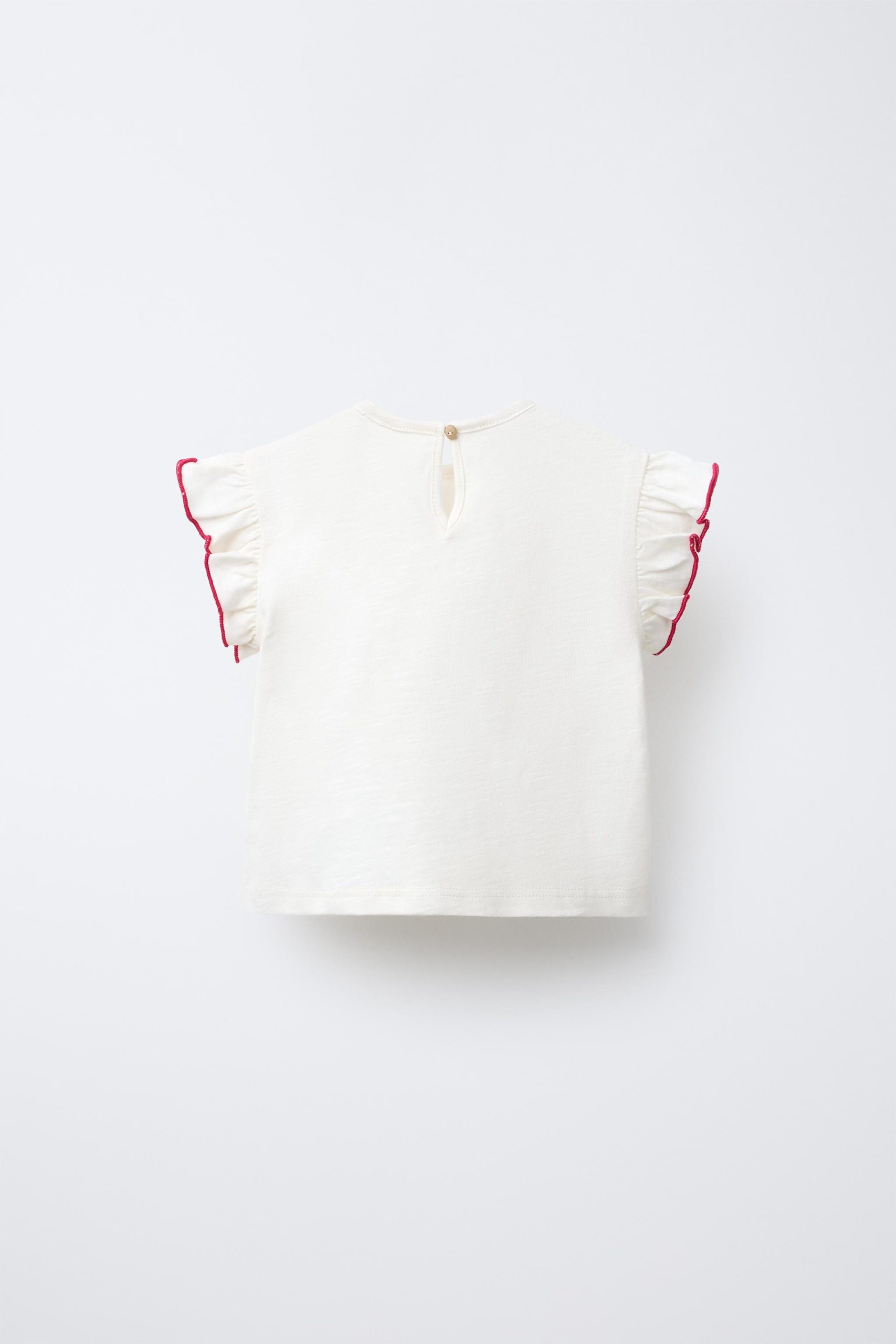 Bisiklet yaka ve volanlı kısa kollu t-shirt. Arkası düğmeli, yırtmaçlı. Göğüs kısmında çiçek aplikeli yama. %100 pamuklu kumaş.