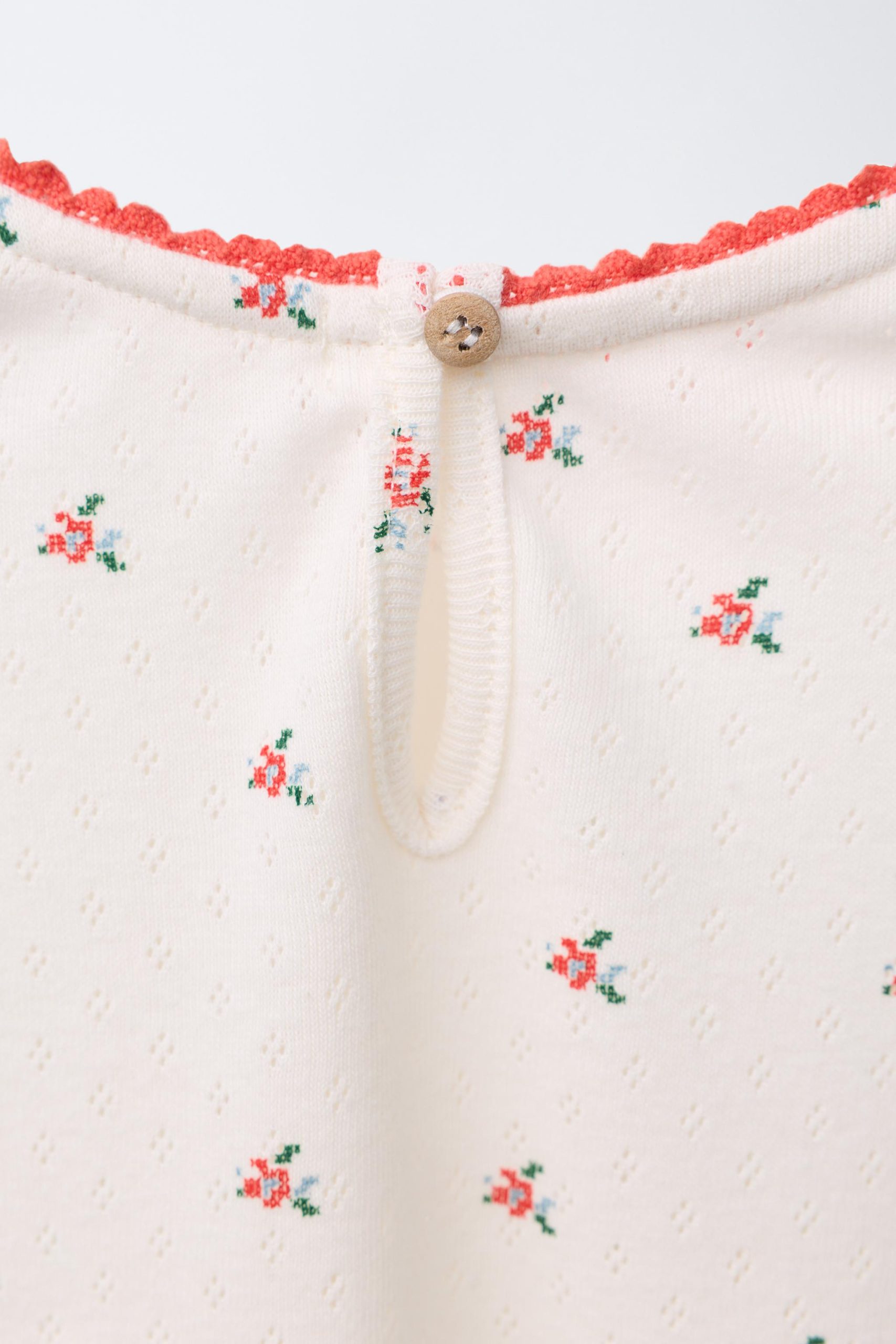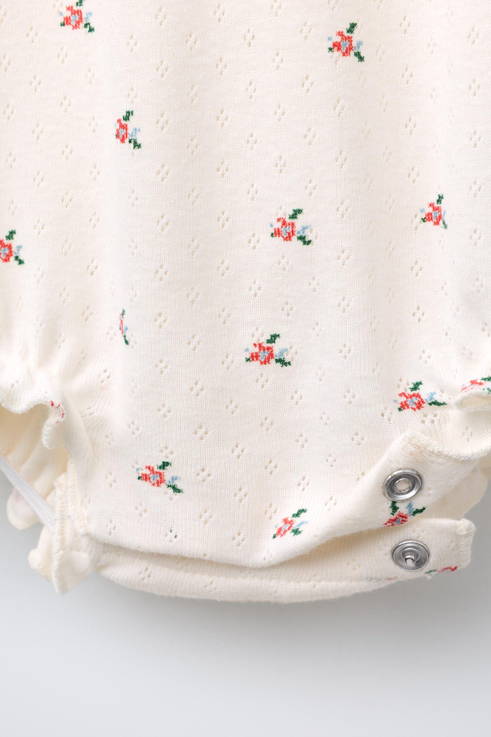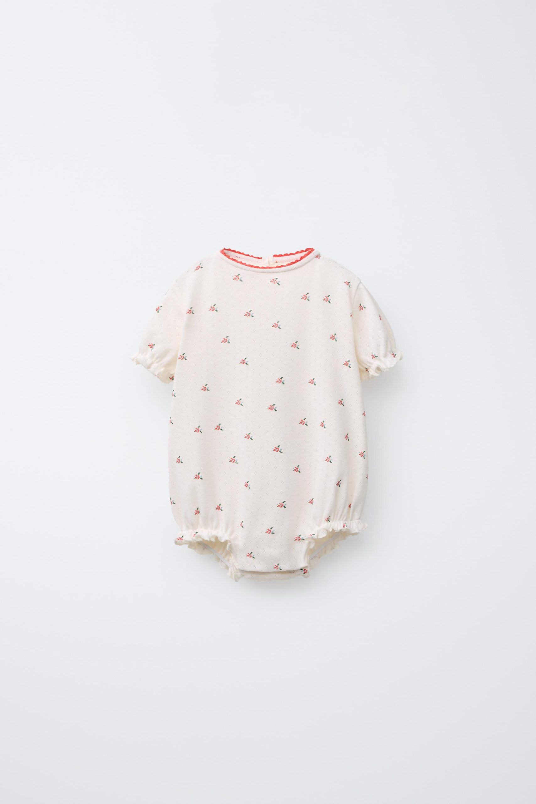 Bisiklet yaka, lastikli kısa kollu body. Arkası düğmeli ve damla şeklinde açıklık detaylı, alt kısmı çıtçıt kapamalı. Yakasında kontrast renkli dantel detay ve çiçek desenli. %100 pamuklu kumaş.