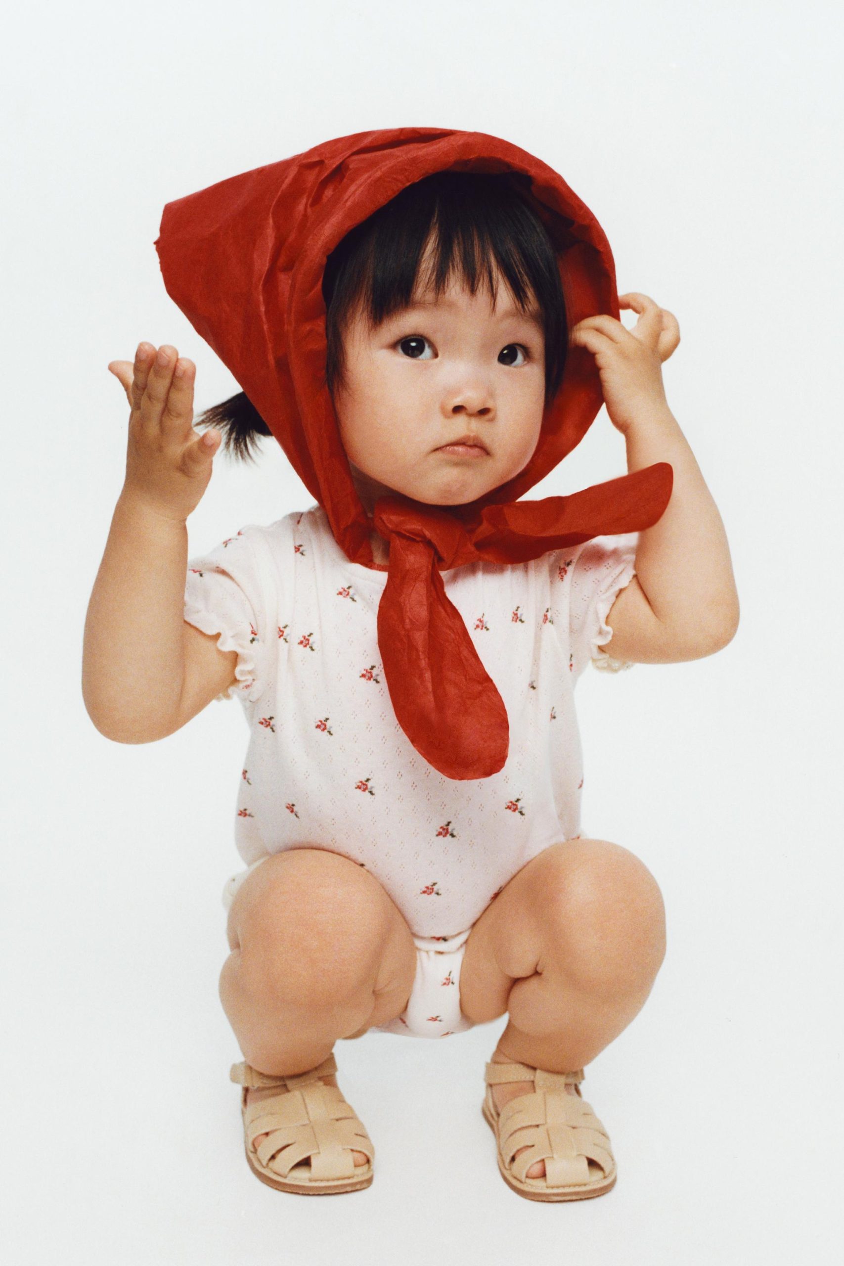 بادی کوتاهکف دست با یقهی بیزیکلت و آستینهای کشی. قسمت پشت آن دکمهدار و دارای جزئیات برش به شکل قطره است و پایین آن با دکمههای فشاری بسته میشود. یقه دارای جزئیات دانتل به رنگ متضاد و طرح گلدار است. از ۱۰۰% پارچهی پنبهای ساخته شده است.