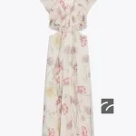 - V yaka ve kısa kollu elbise. Fırfır detaylı ve iç astarlı yarı transparan kumaş. Yanlarda yırtmaçlı bel kısmı. Önü yırtmaçlı etek ucu. Arkası dikişe gizlenmiş gizli fermuarlı.