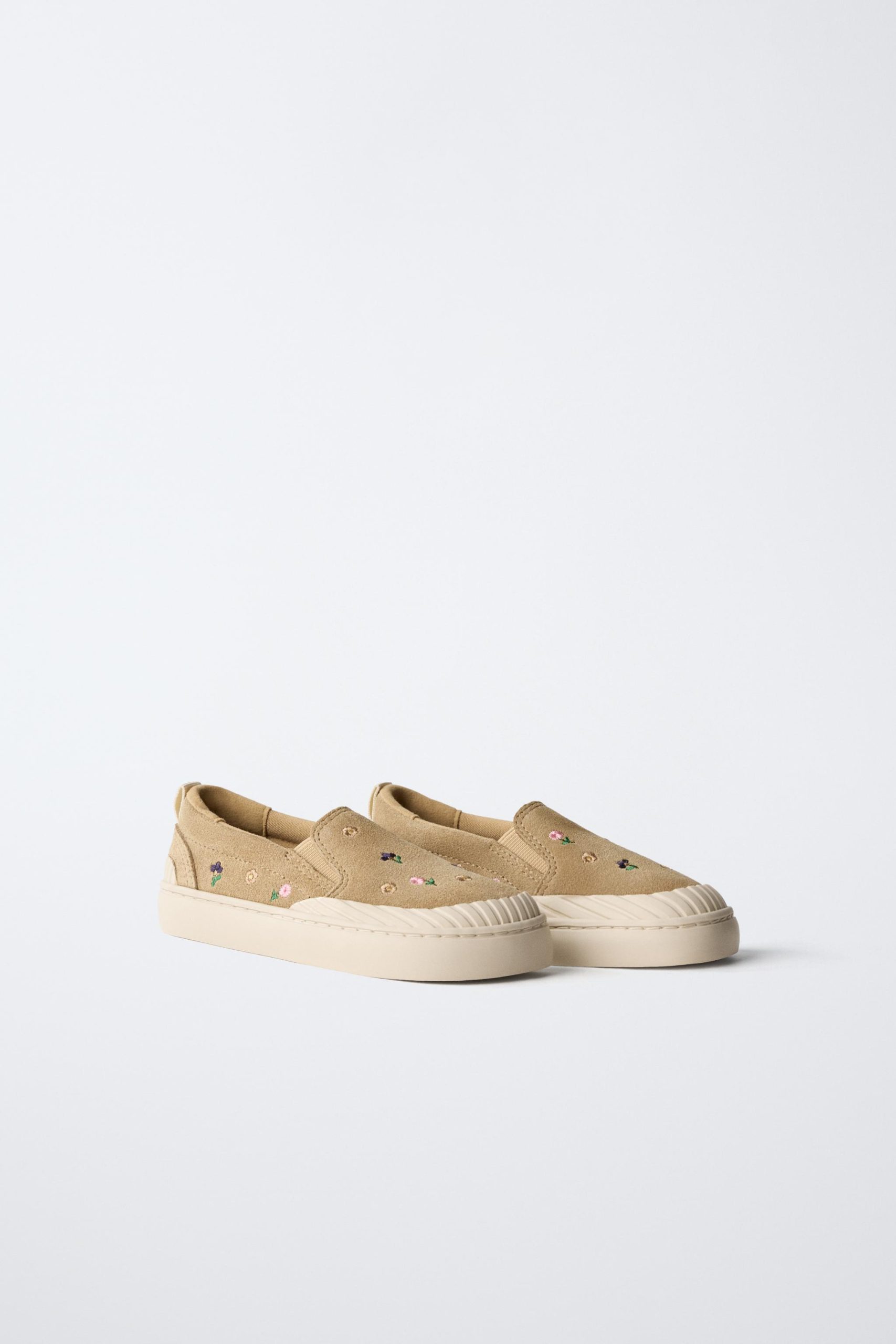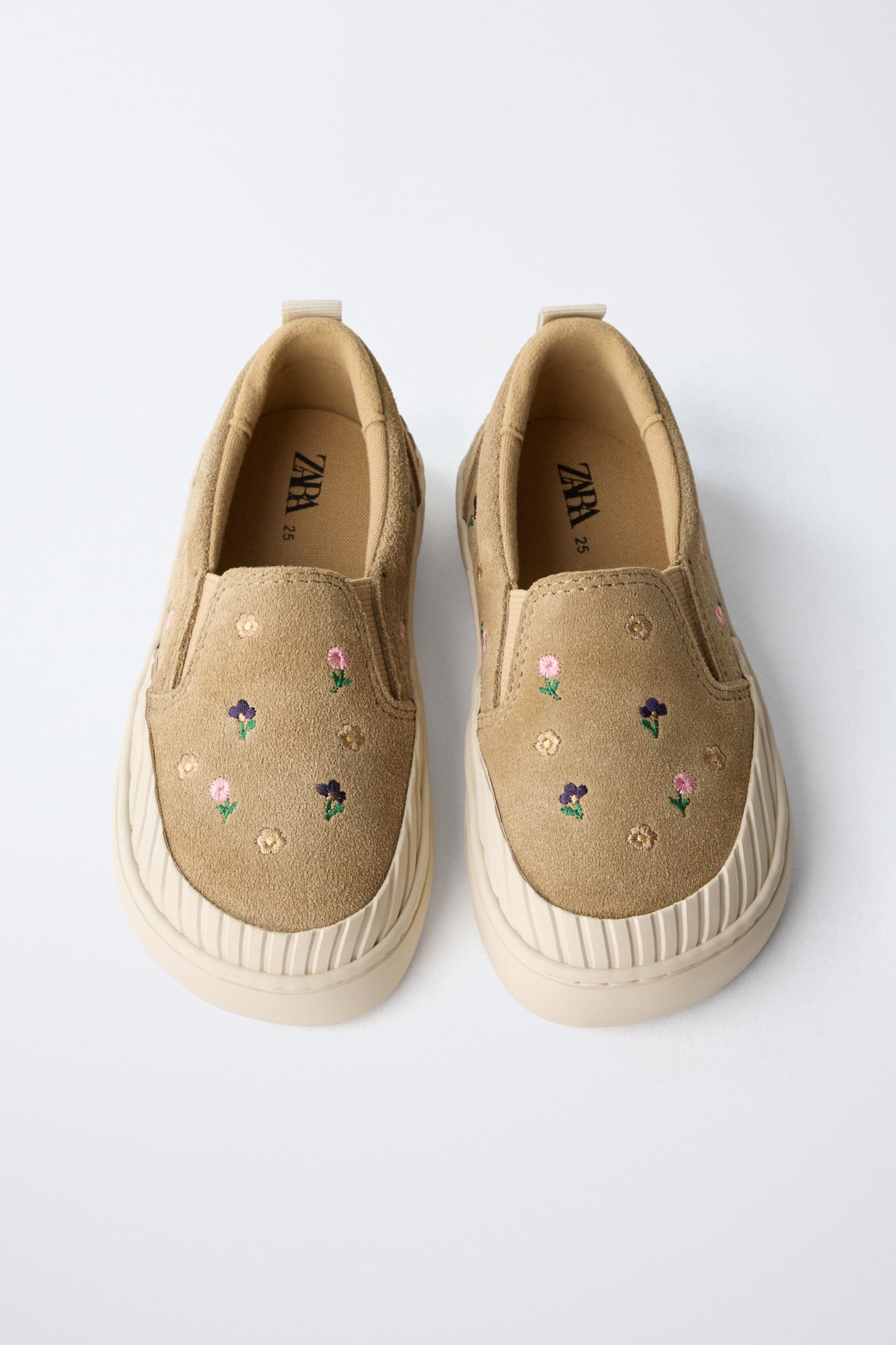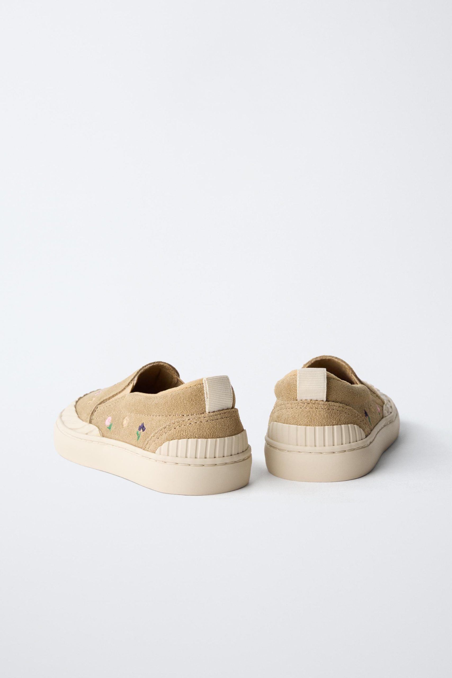 %86 dana derisi bamba tipi, çiçek işlemeli spor ayakkabı. Ayak üstünde lastiği ve giymeyi kolaylaştıran arka çekme şeridi bulunur. Esnek iç tabanlı, lastik burunlu, lastik tabanlı.