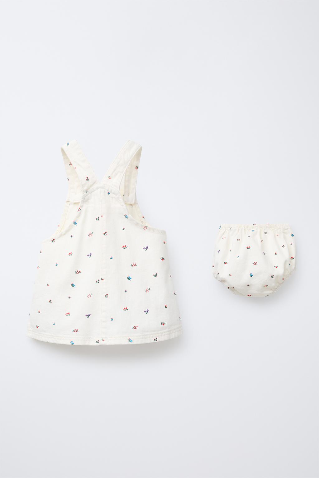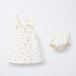 Düz yakalı ve önü düğme kapamalı askılı jile. Göğüs kısmında yama cep. Lastikli belli külot. Çiçek baskılı.