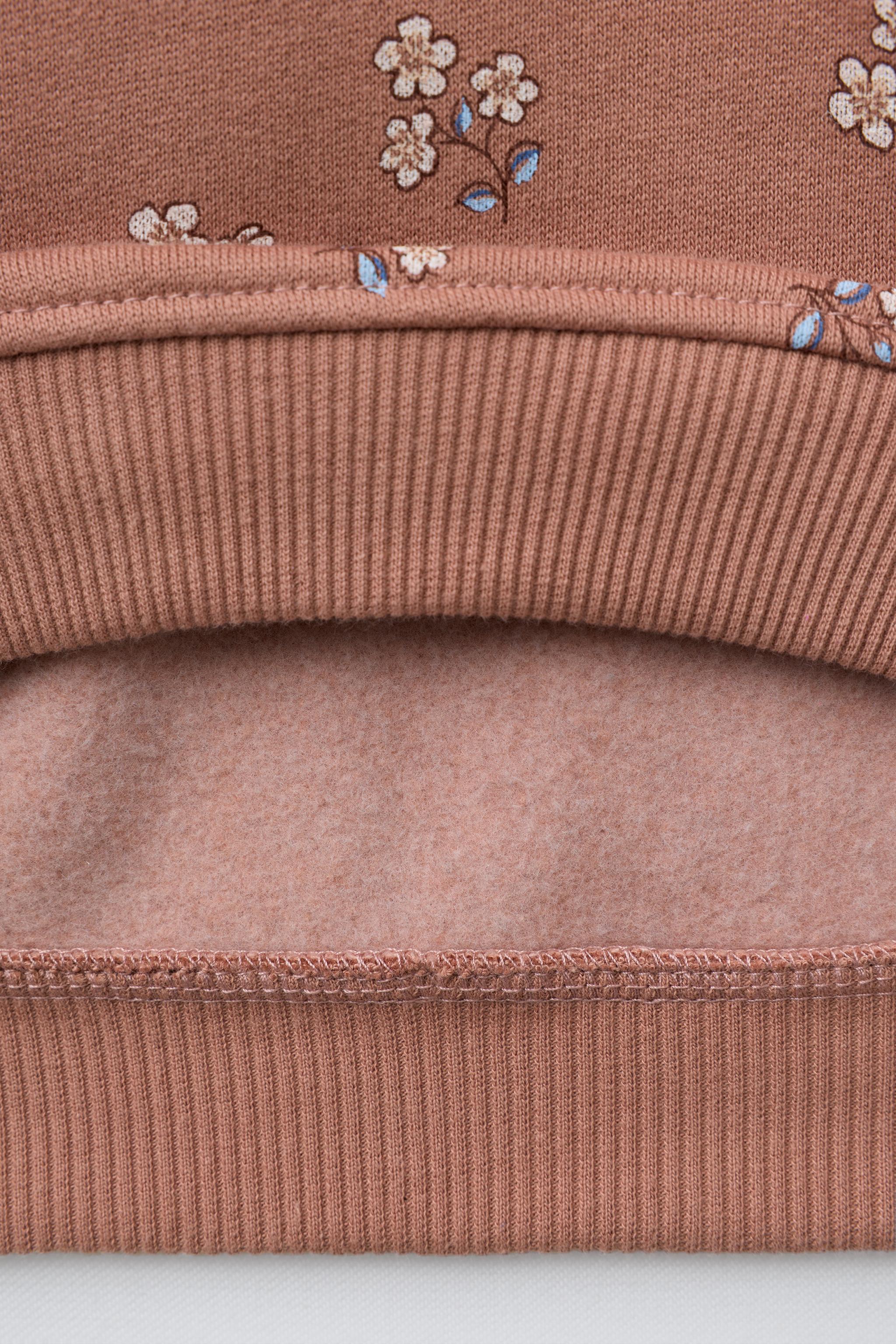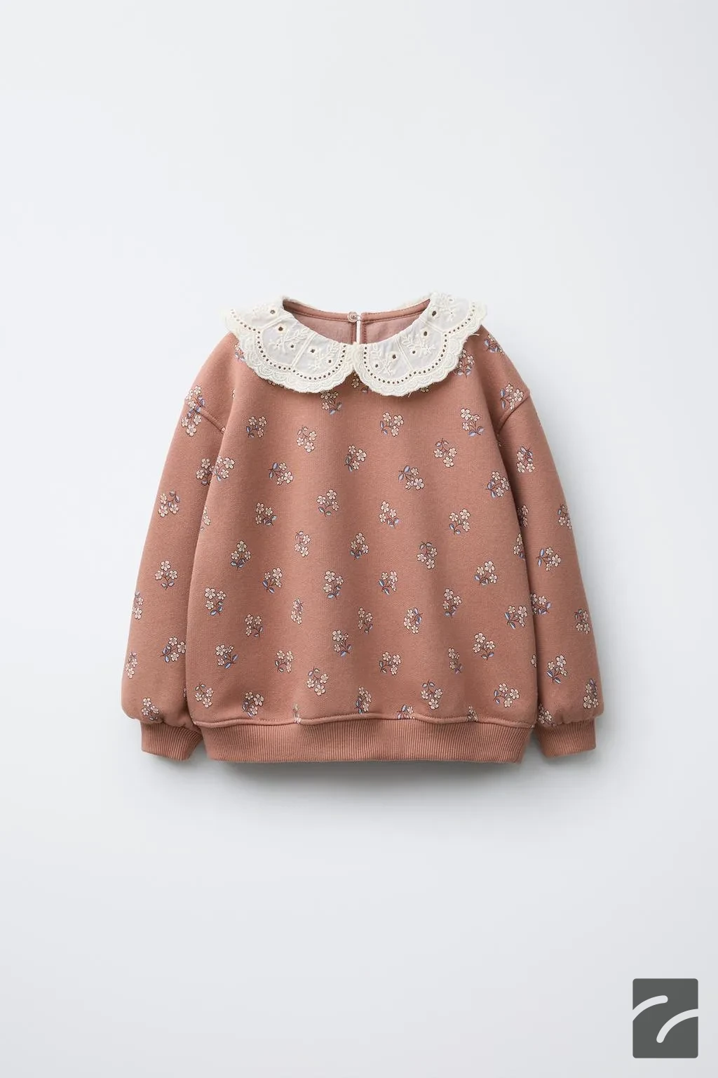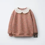 Bebe yaka işlemeli, uzun kollu sweatshirt. Fitilli kenarlı. Arkası düğmeli damla detaylı. Çiçek desenli. İçi şardonlu, sıcak ve yumuşak dokulu. %81 pamuklu kumaş.